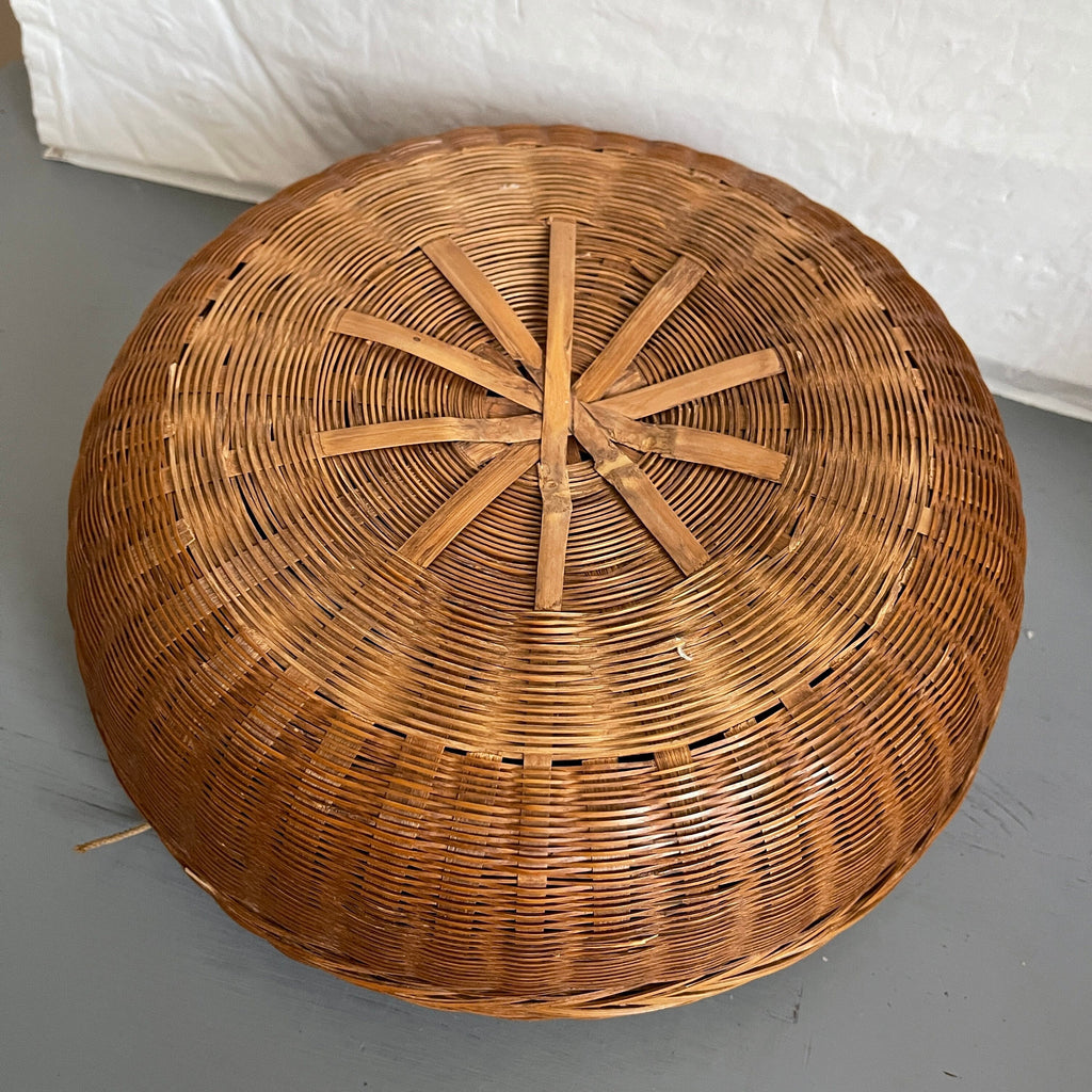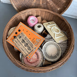 Nice Vintage 10.5 Inch Round Sewing Basket with Wooden Spools DMC Cotton pins etc.