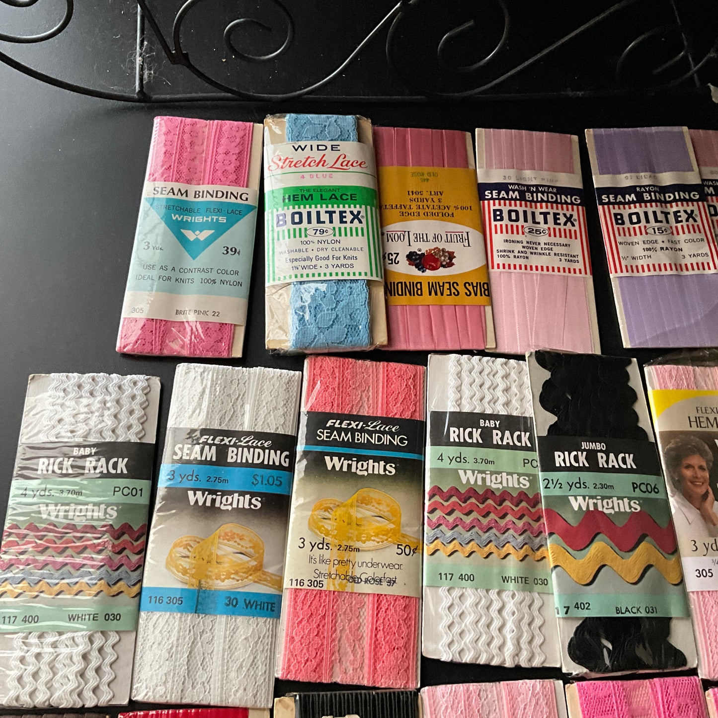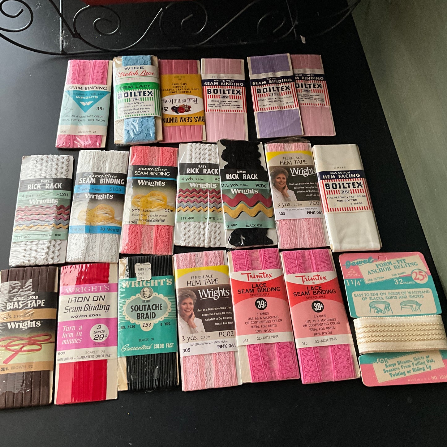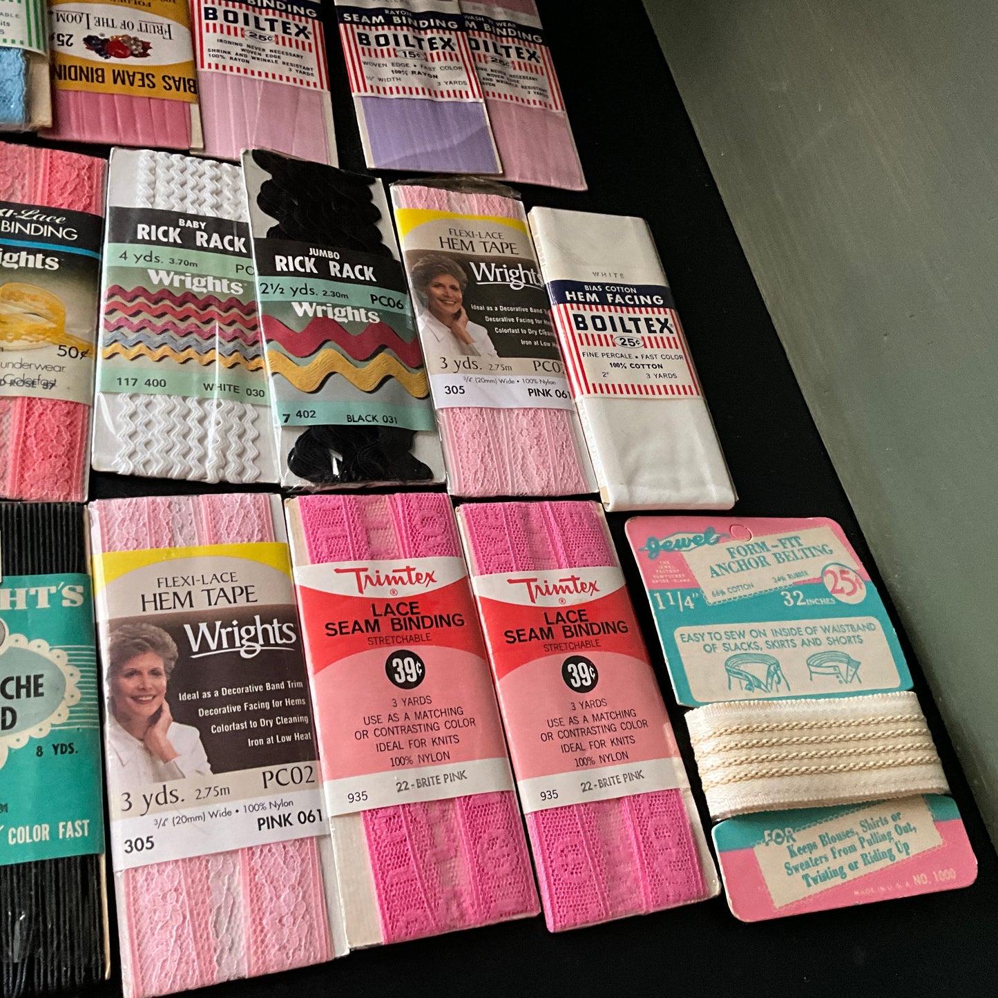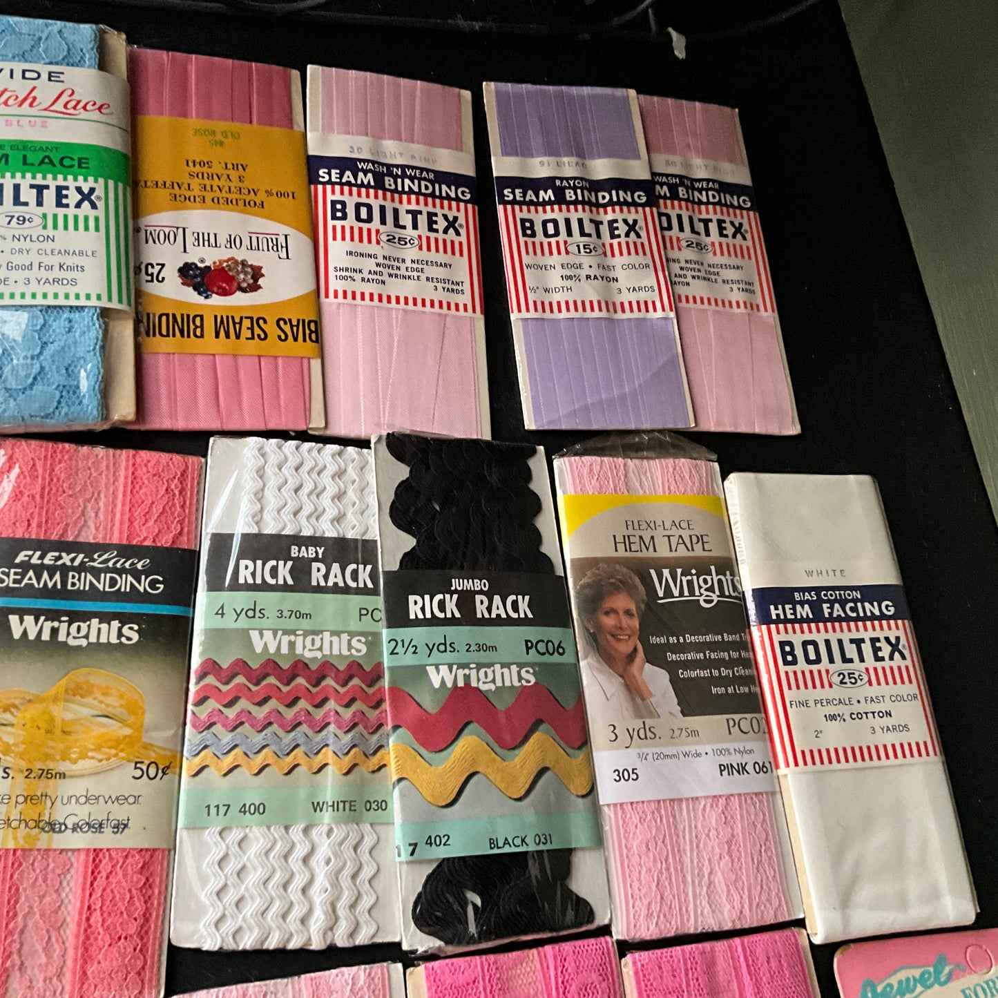 *seam binding, hem lace, rickrack, and hem facing