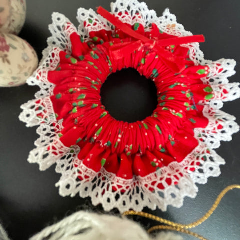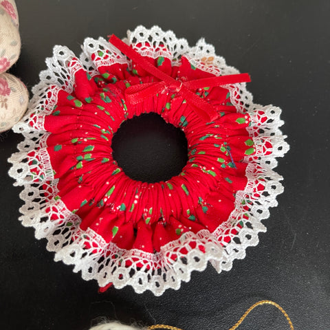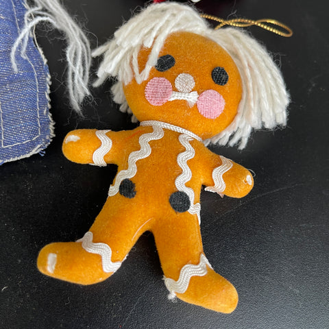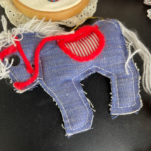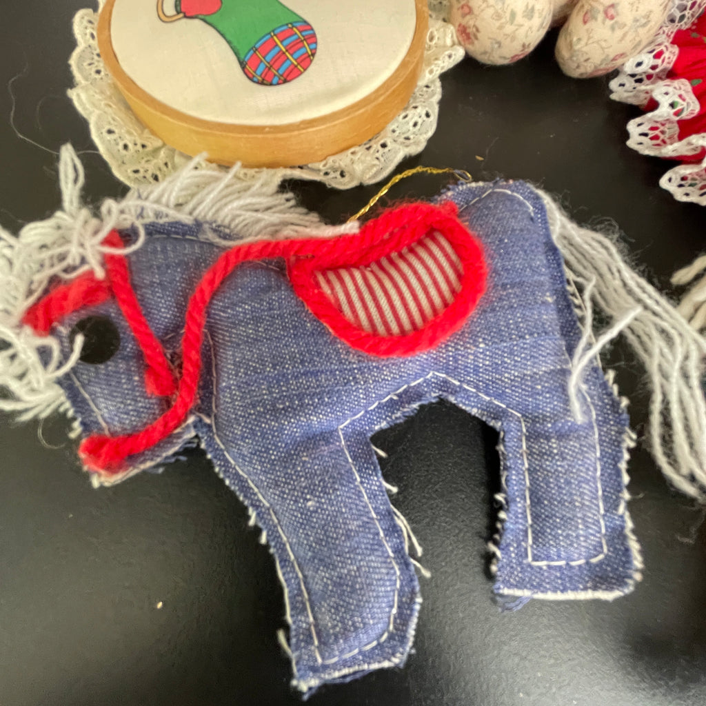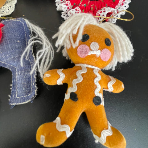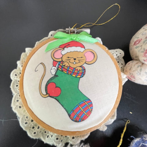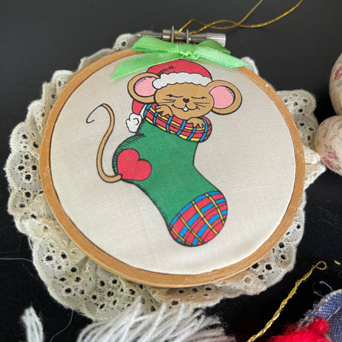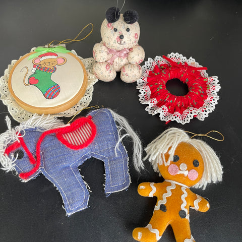 Fun crafting themed set of 5 vintage cloth ornaments mouse in hoop, gingerbread man, horse, teddy bear, and wreath