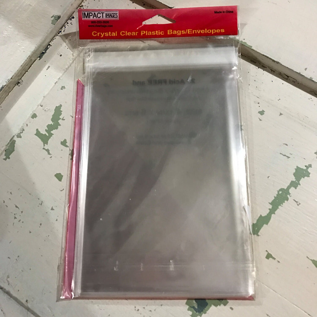 Impact Images Crystal Clear Plastic Bags/Envelopes. 25 acid free and archival quality bags/envelopes with flap and re-sealable glue strip. Size is 4 15/16 X 6 9/16.