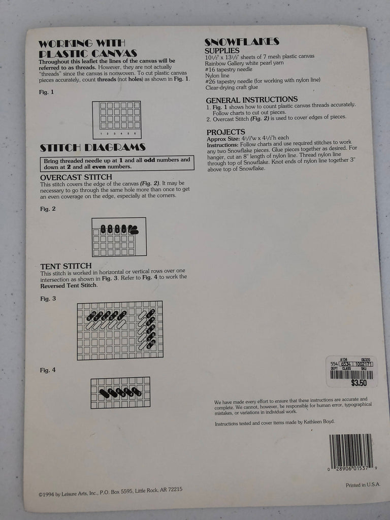Vintage 1994, Leisure Arts, Snowflakes in Plastic Canvas, by Joan Green, Create Your Own Snowflakes Leaflet 1537