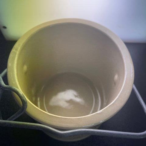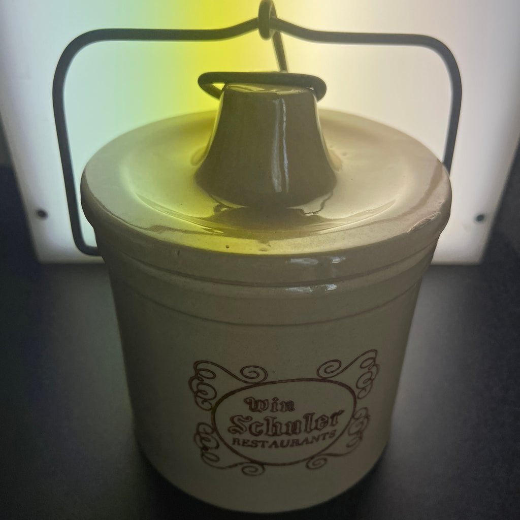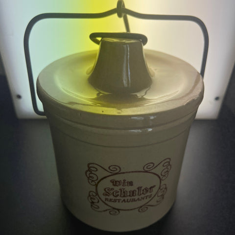 Win Schuler Restaurants Vintage Stoneware Crock with Metal Bail Stoneware Lid 5.25 by 4.75Inches