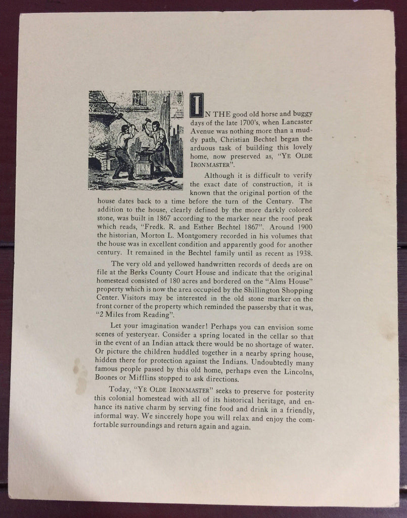 Vintage menu Ye Olde Ironmaster Reading. Pennsylvania