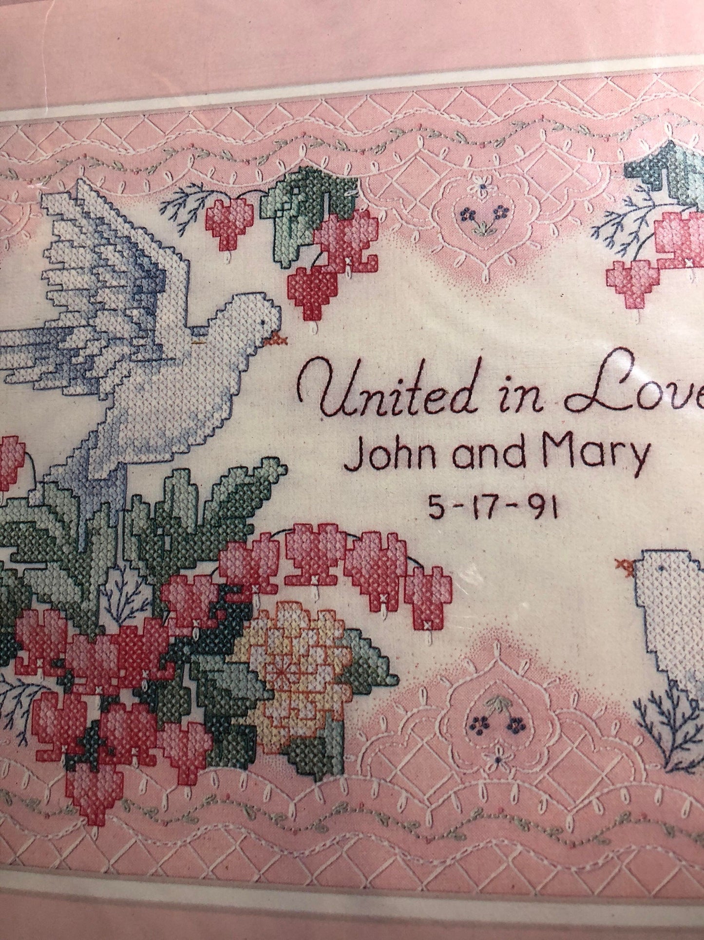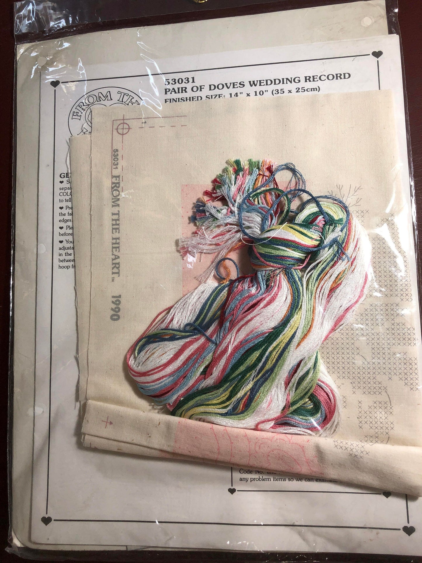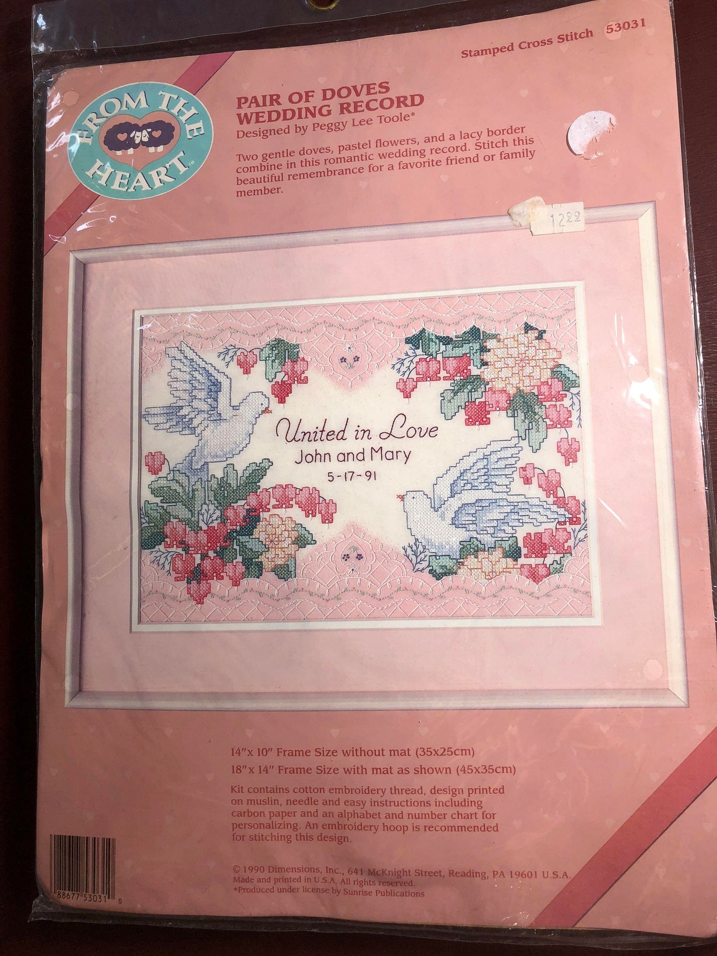 Vintage, 1990, Pair of Doves, Wedding Record, Designed by Peggy Lee Toole, From the Heart Stamped, counted cross stitch kit