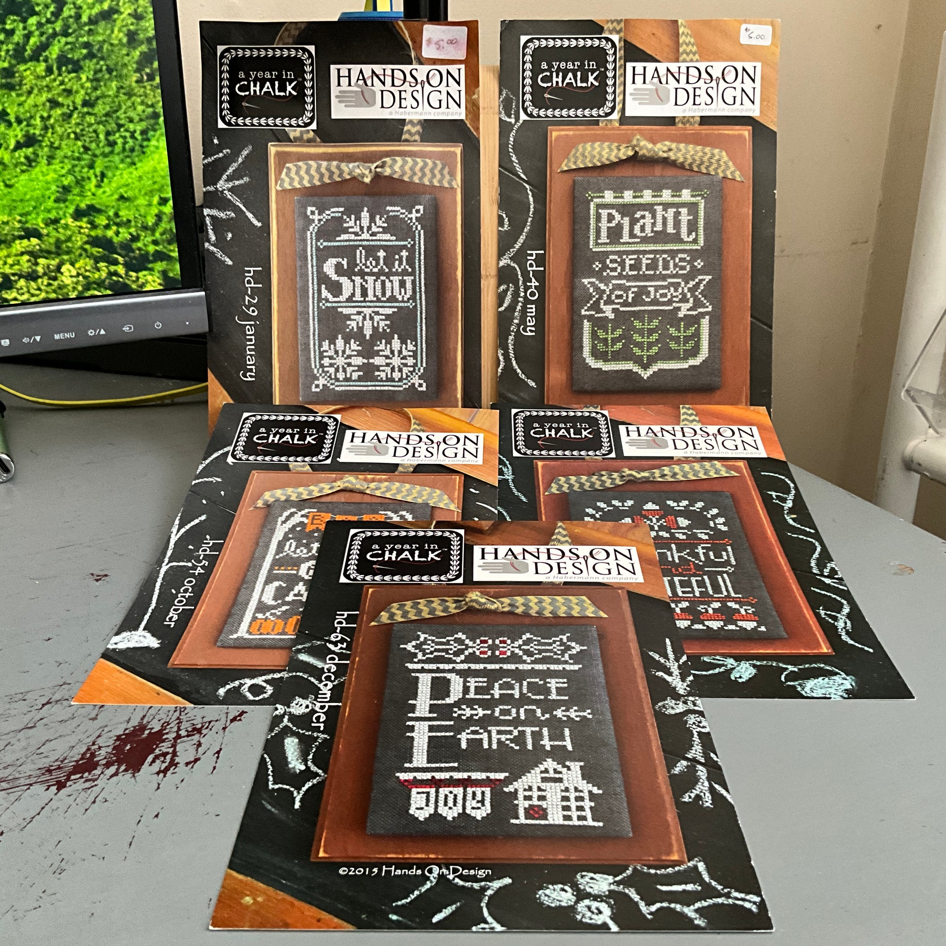 Hands On design A Year In Chalk set of 5 counted cross stitch charts Han, May, Oct, Nov, & Dec