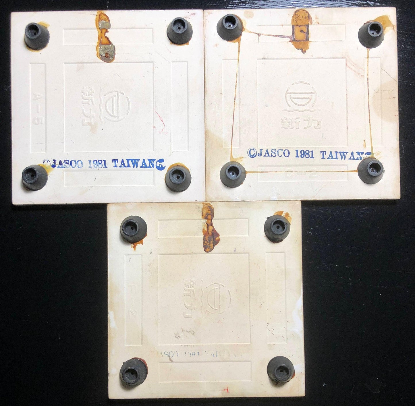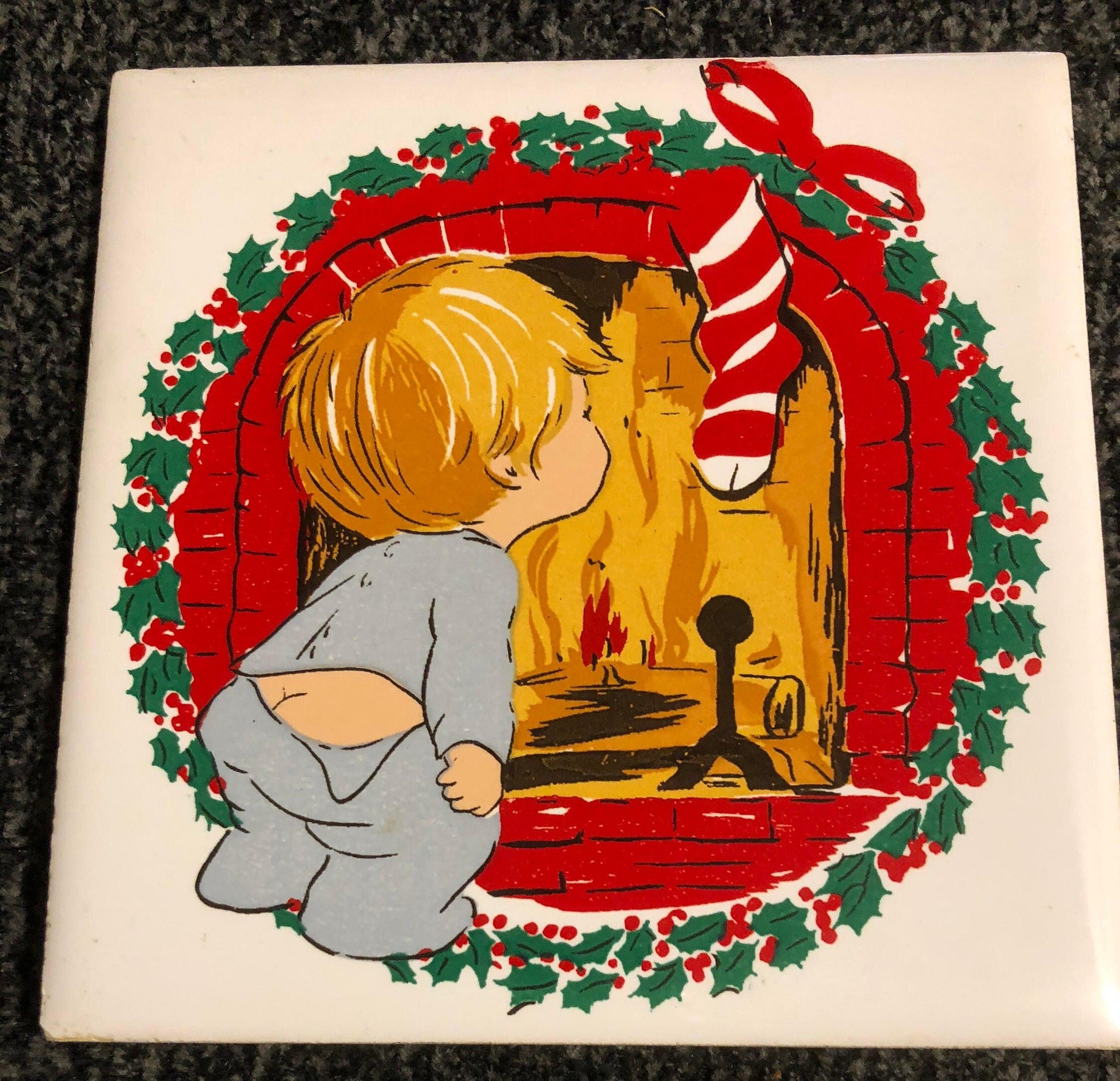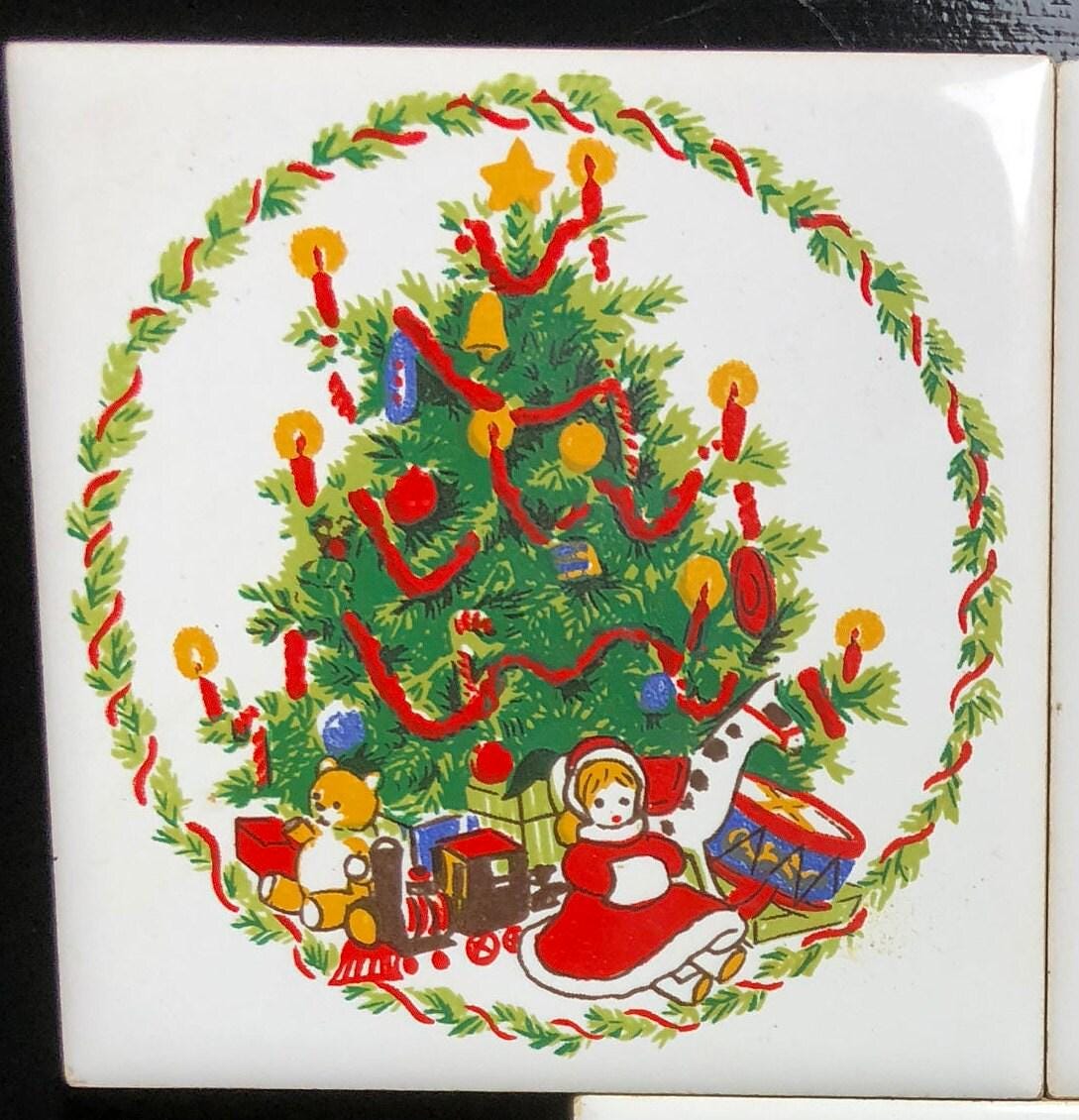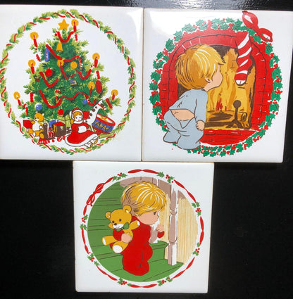 Jasco, Child with Teddy Bear, Christmas Tree, and (2) Two Boy by the Fire, Vintage, 1981, Set of Four (4) Tile Trivets