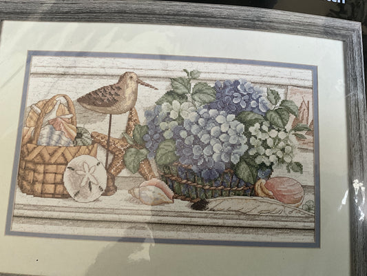 Tranquil beach with sand dollar and seashells cross stitch picture finished project in blue frame