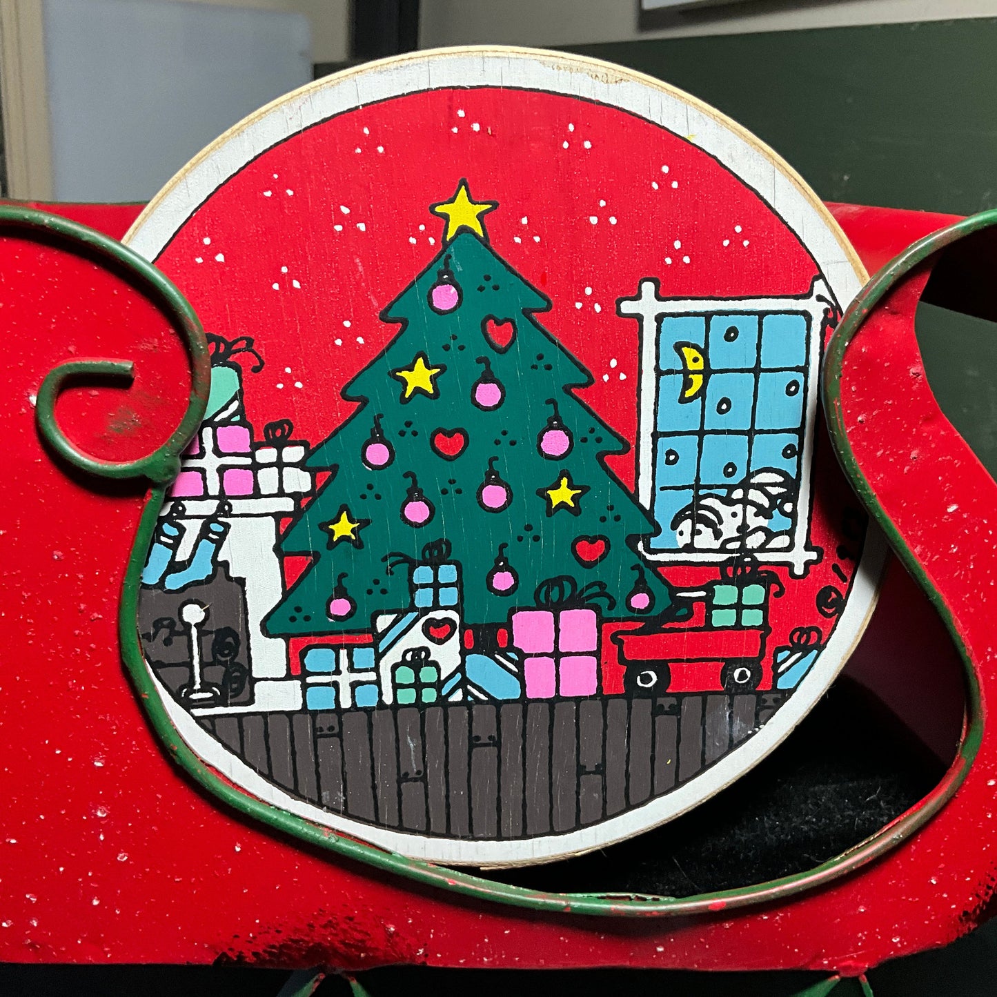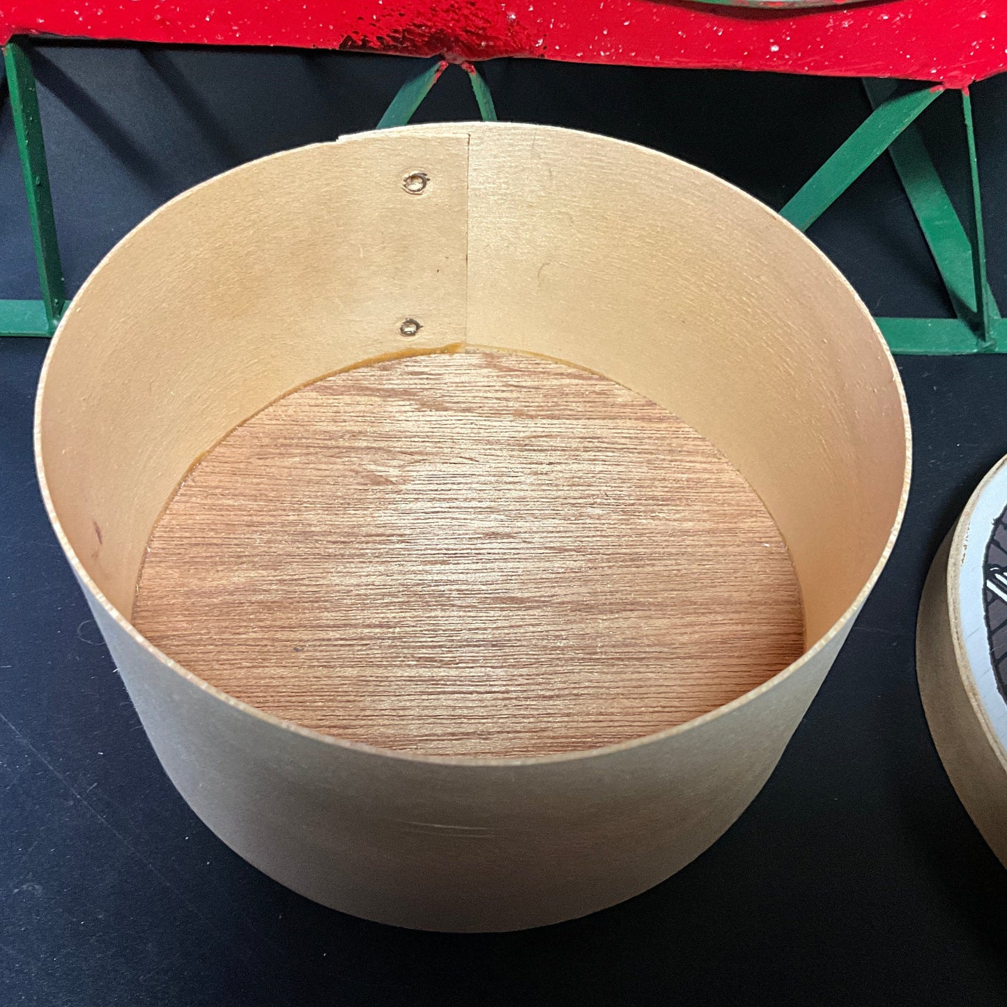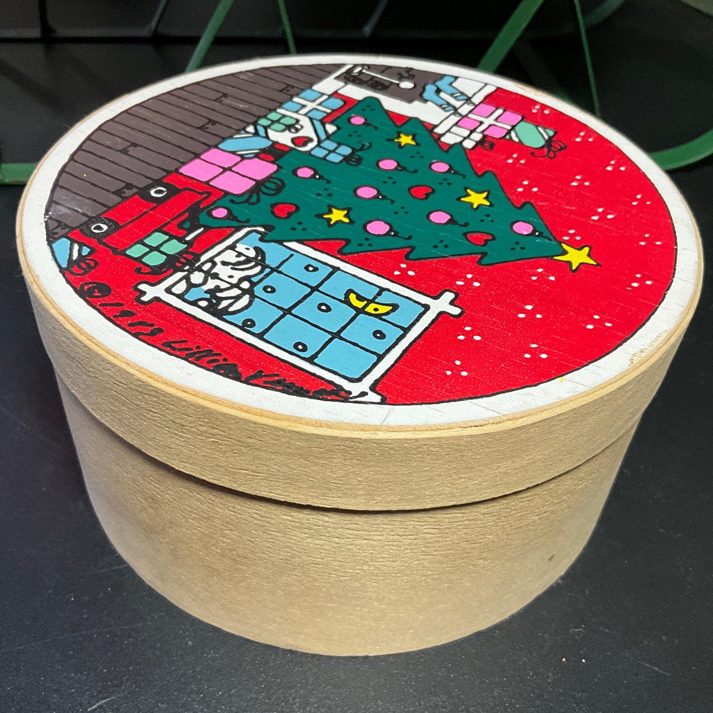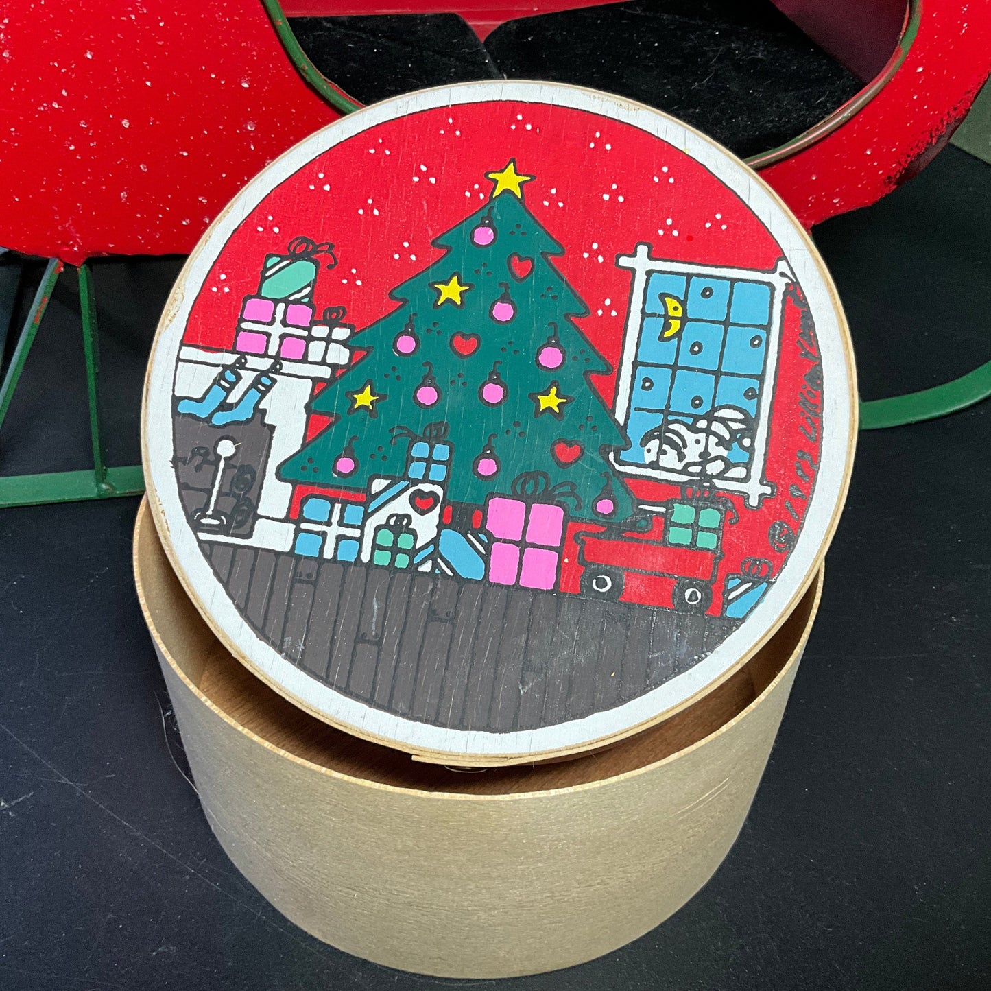 Lovely Lillian Vernon Christmas vintage round wooden box depicting scene with tee with gifts and toys by the fireplace vintage collectible