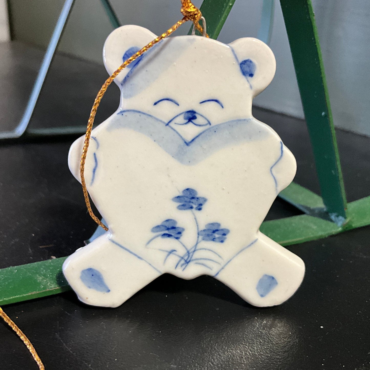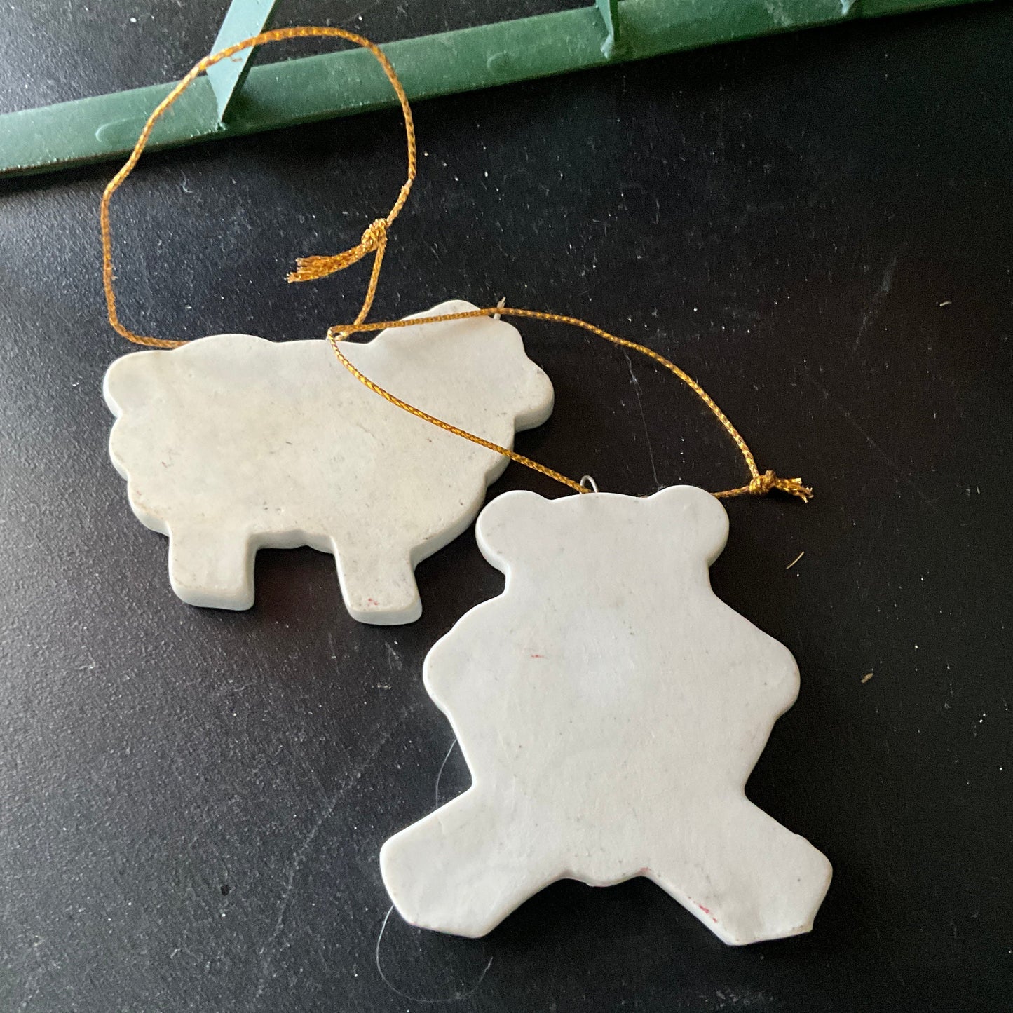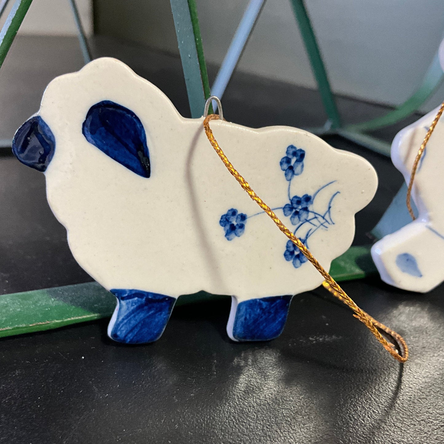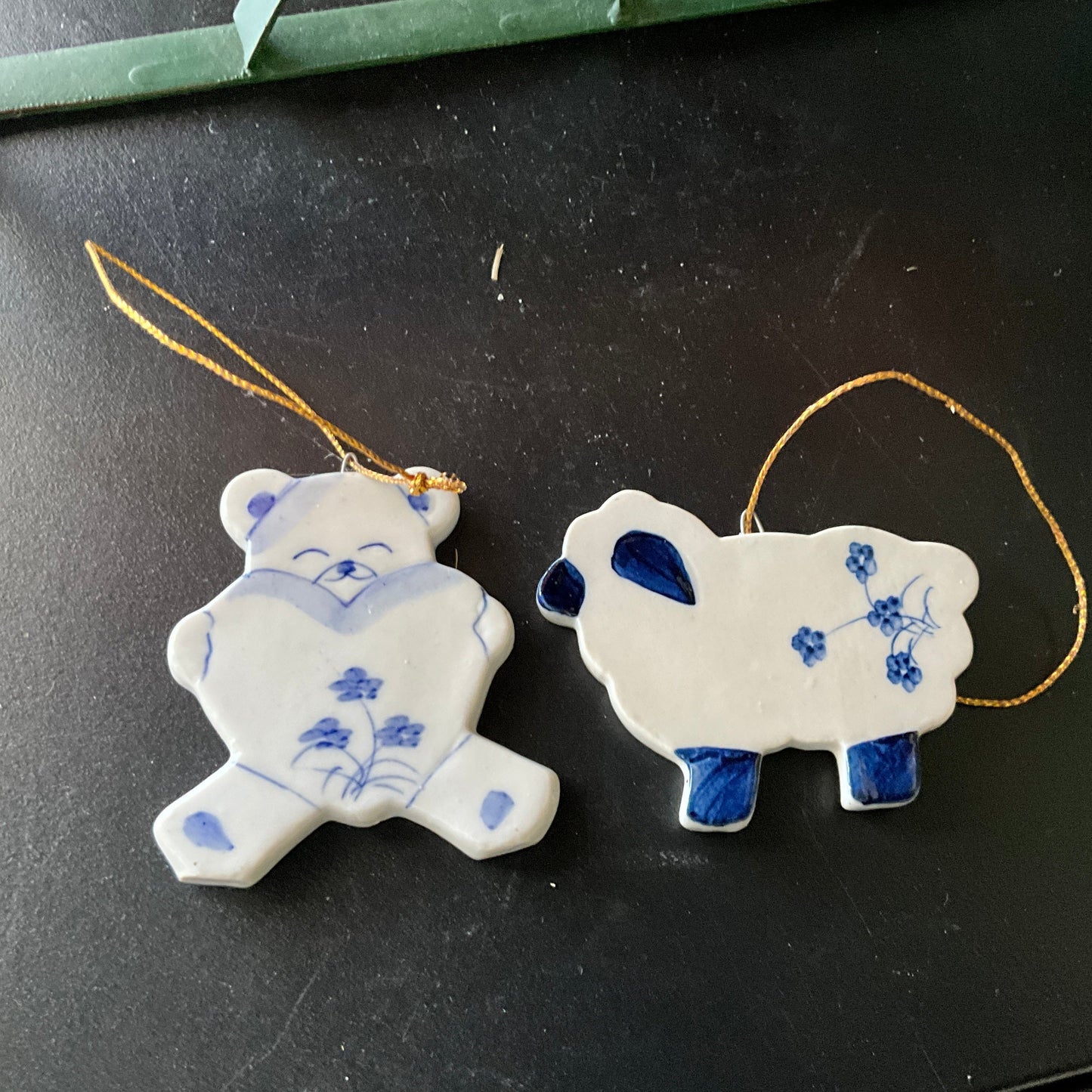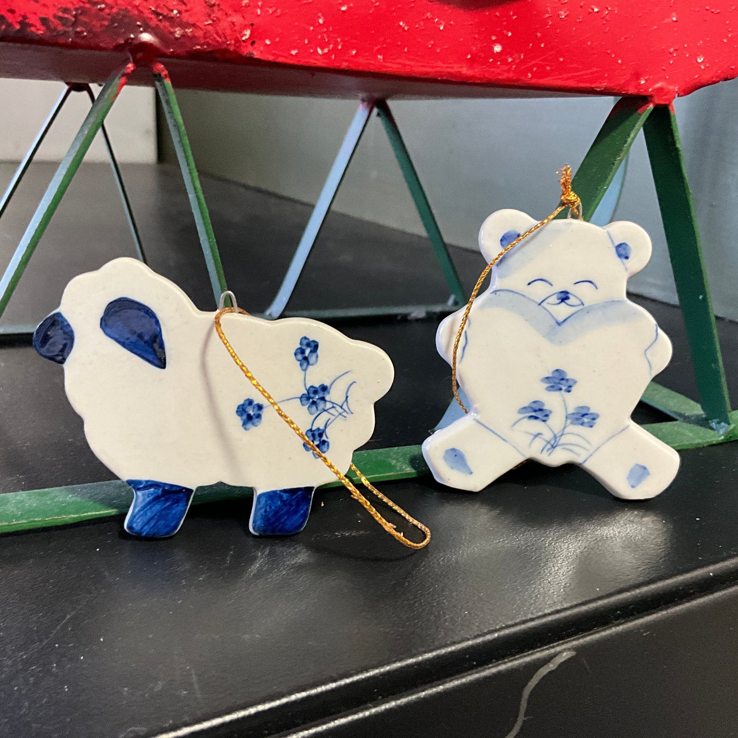 Teddy Bear and Sheep set pf 2 blue and white ceramic Christmas ornaments