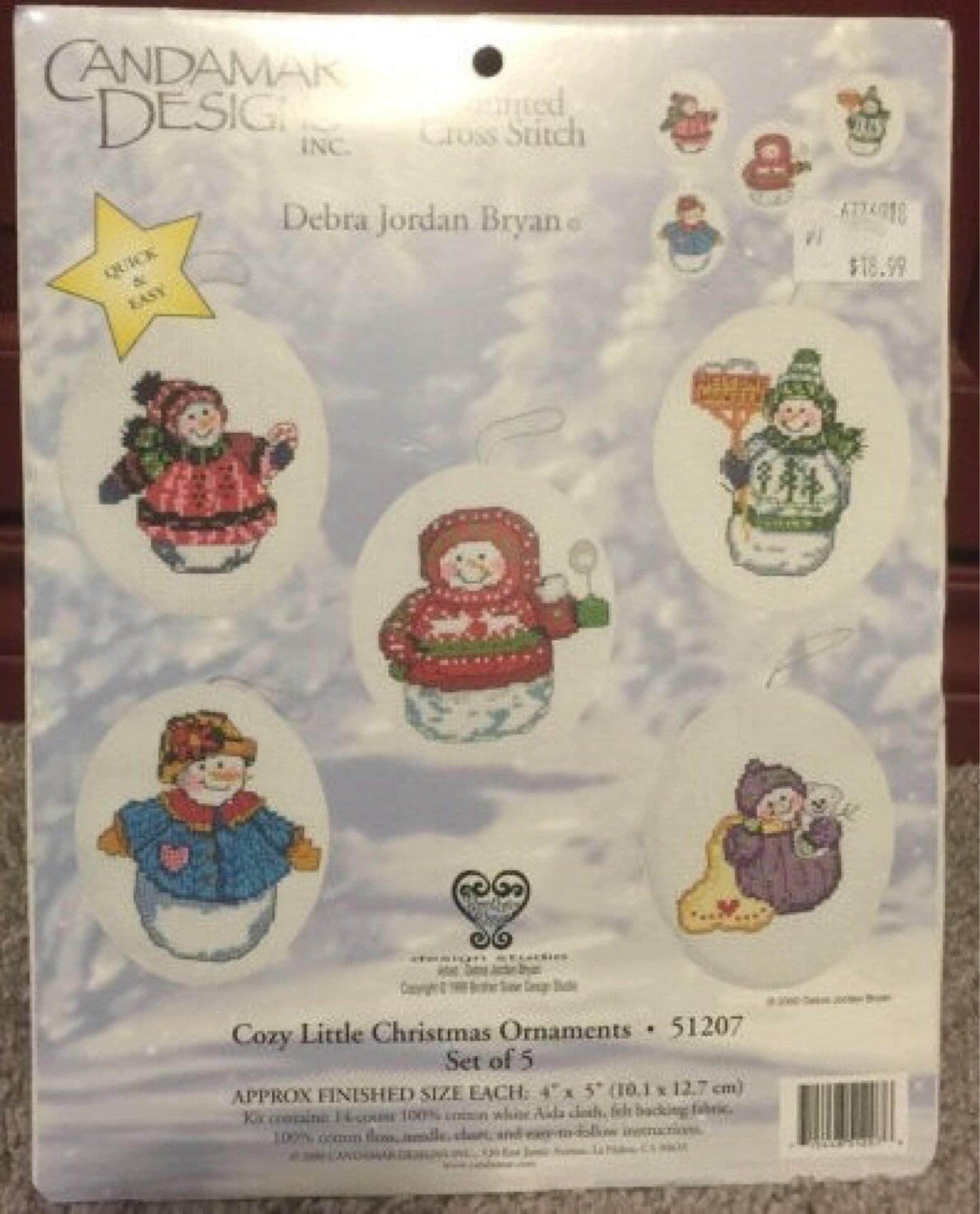 Cozy Little Christmas Ornaments , set of 5 counted cross stitch snowmen Candamar Designs by Debra Jordan Bryan. Kit is sealed, never been open, never been used. Kit includes floss and 14 count white Aida cloth to complete the project.