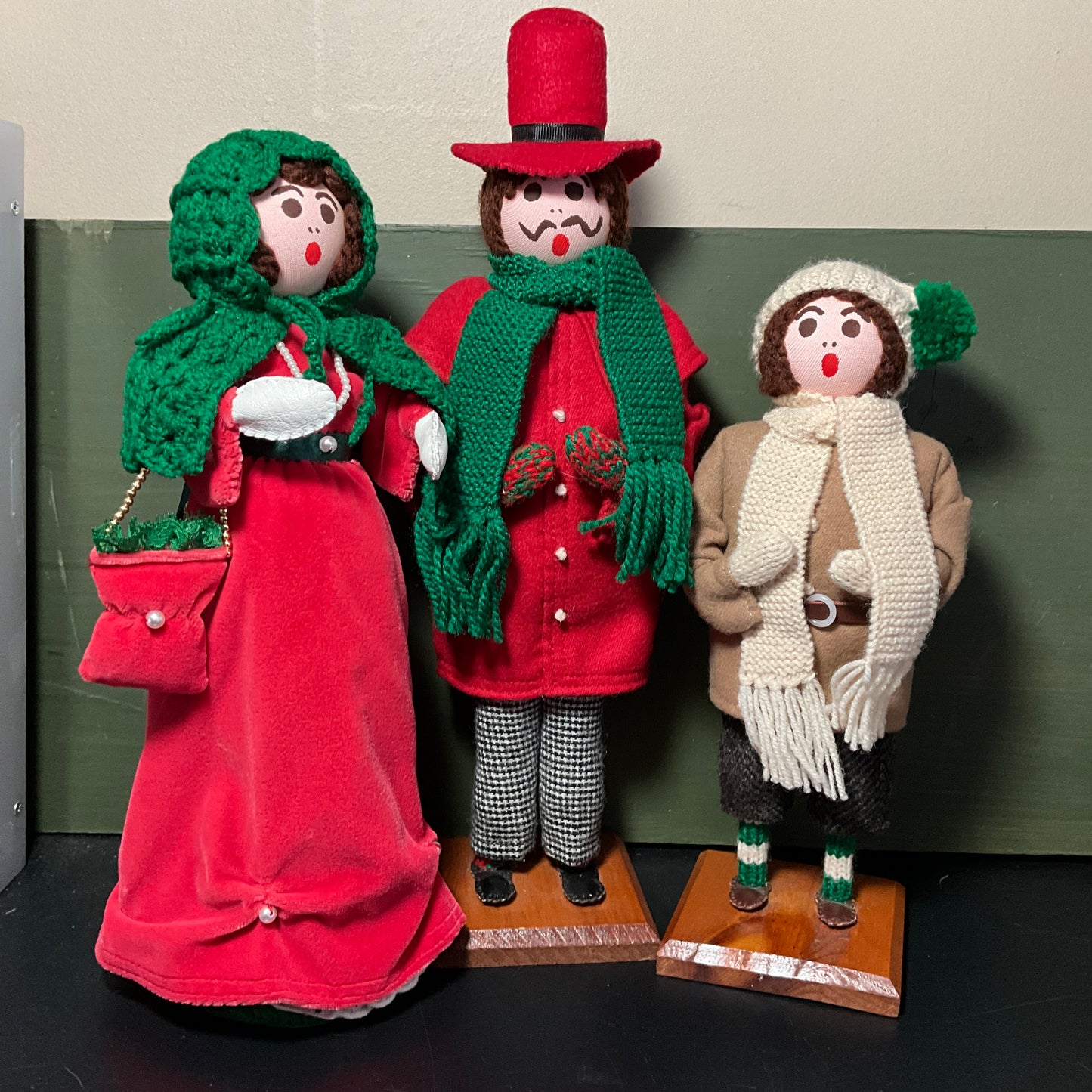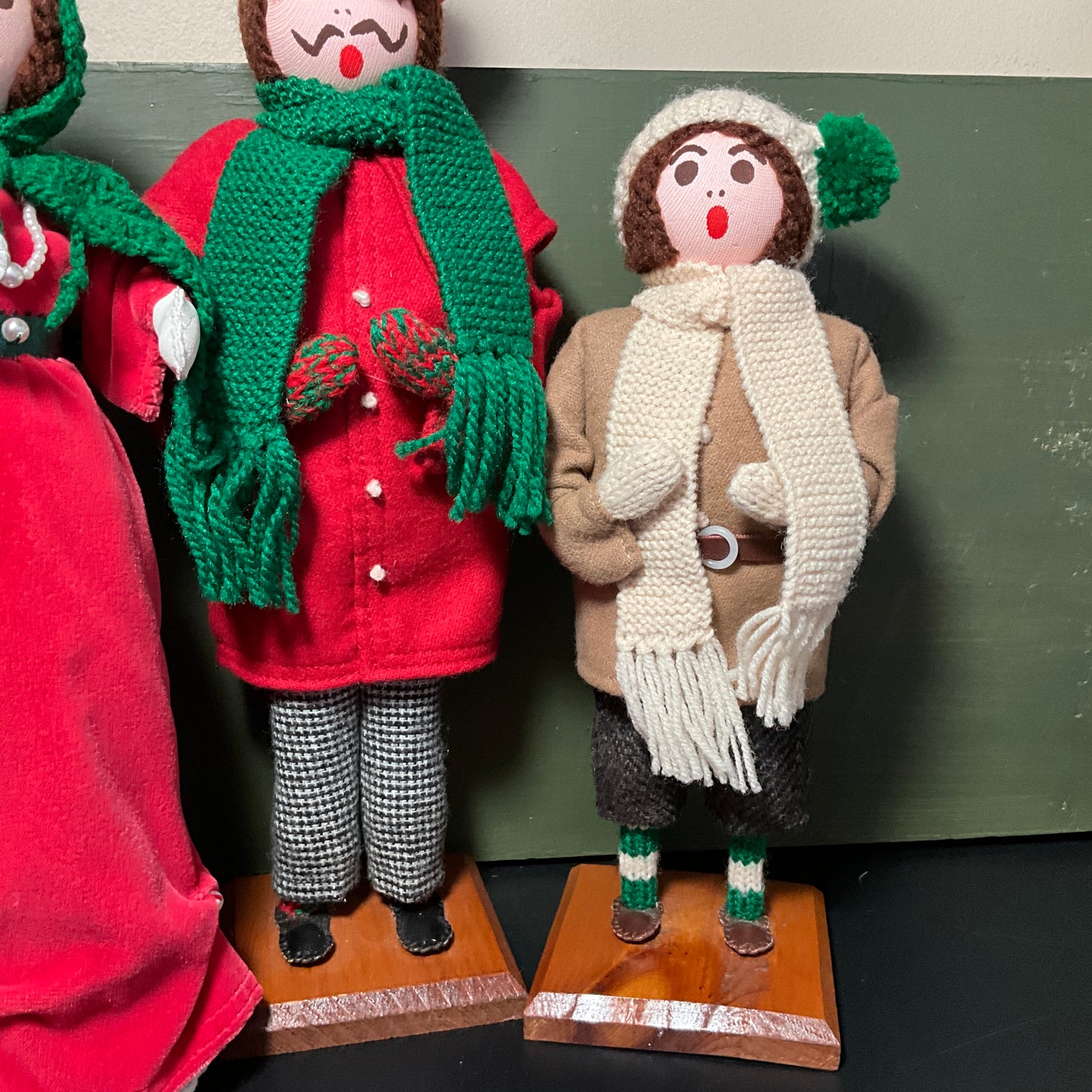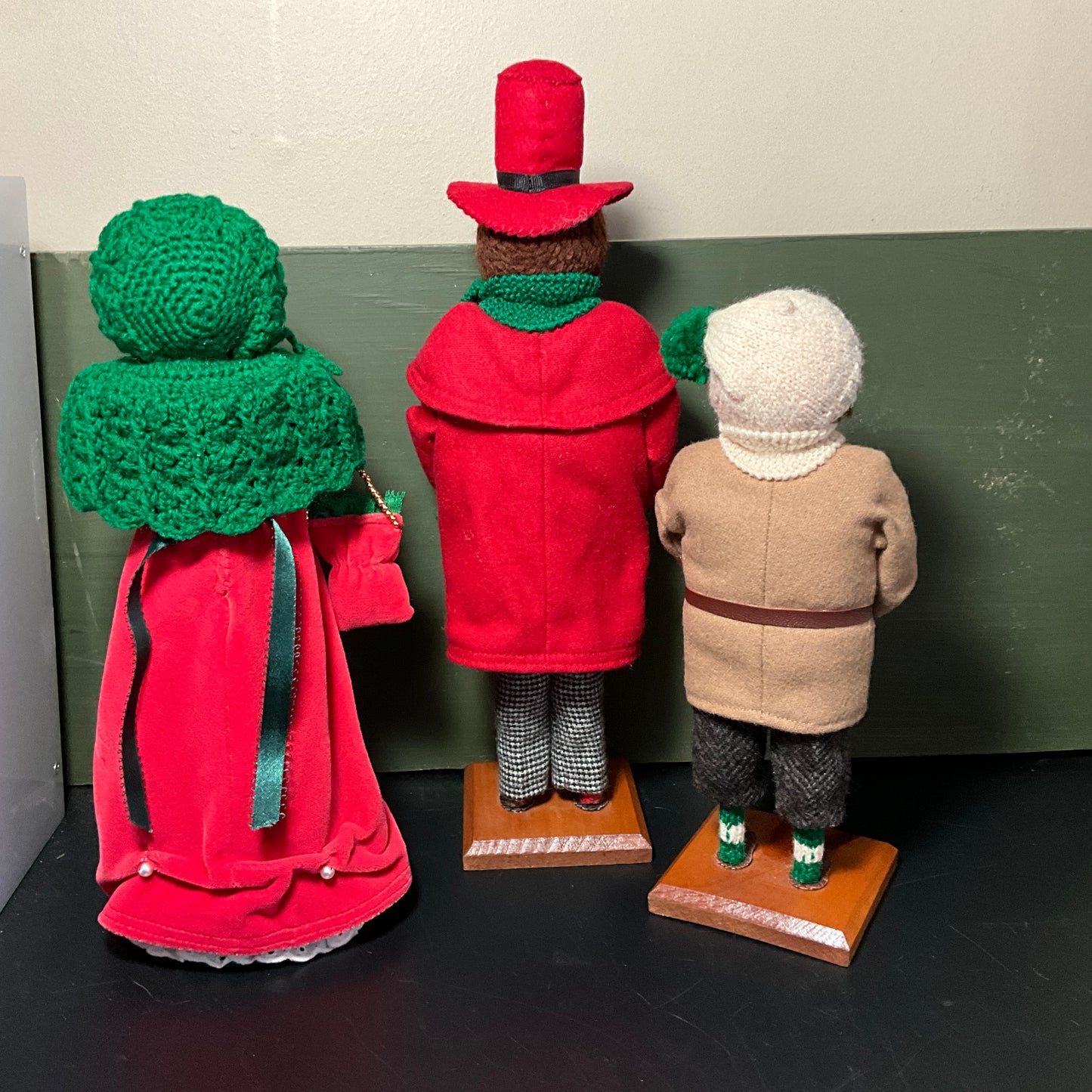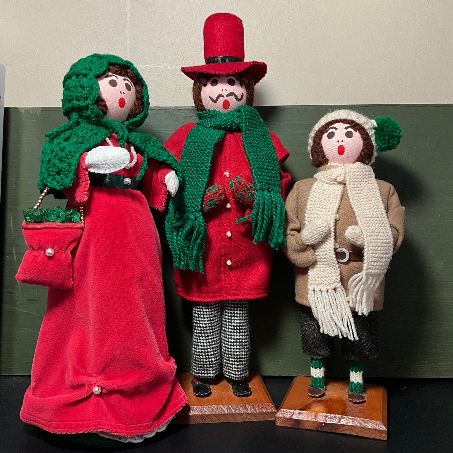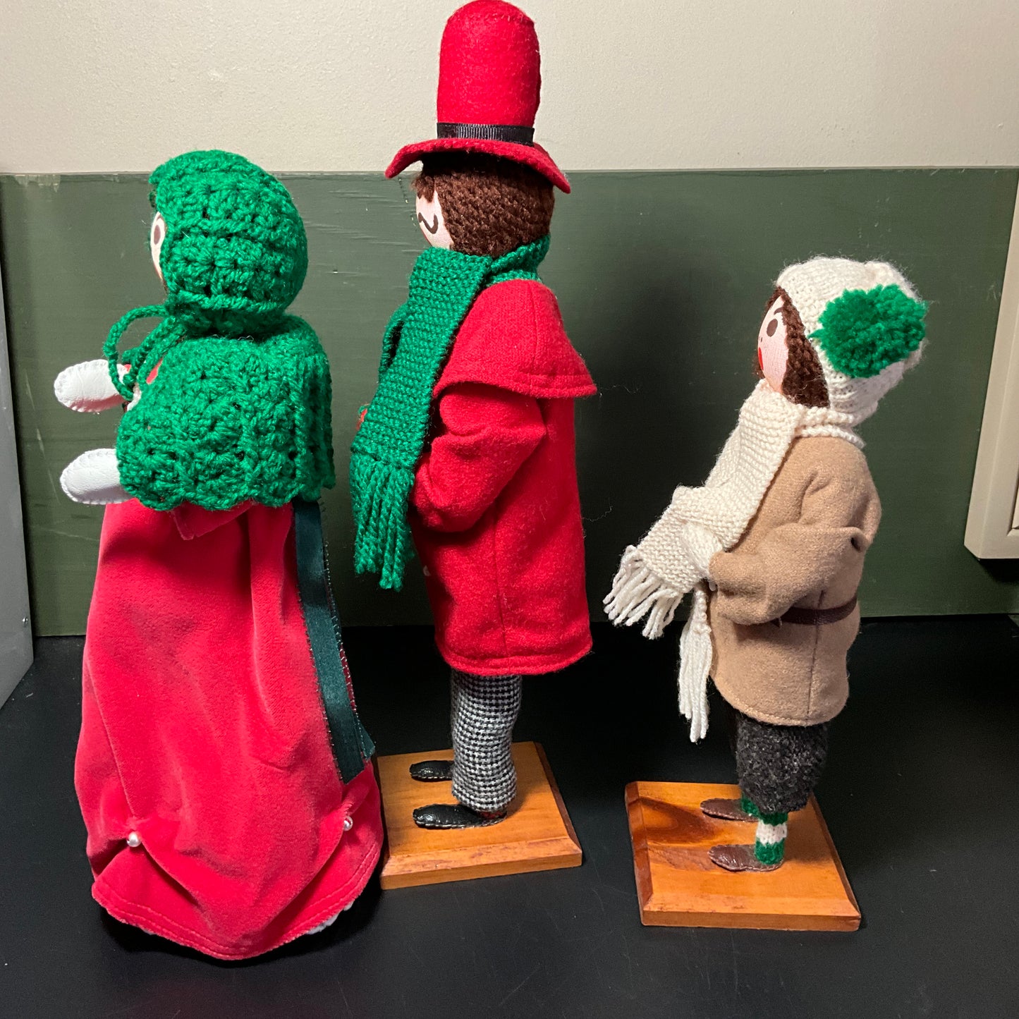 Charming Christmas carolers on wooden pedestals set of 3 handmade vintage collectible figurines