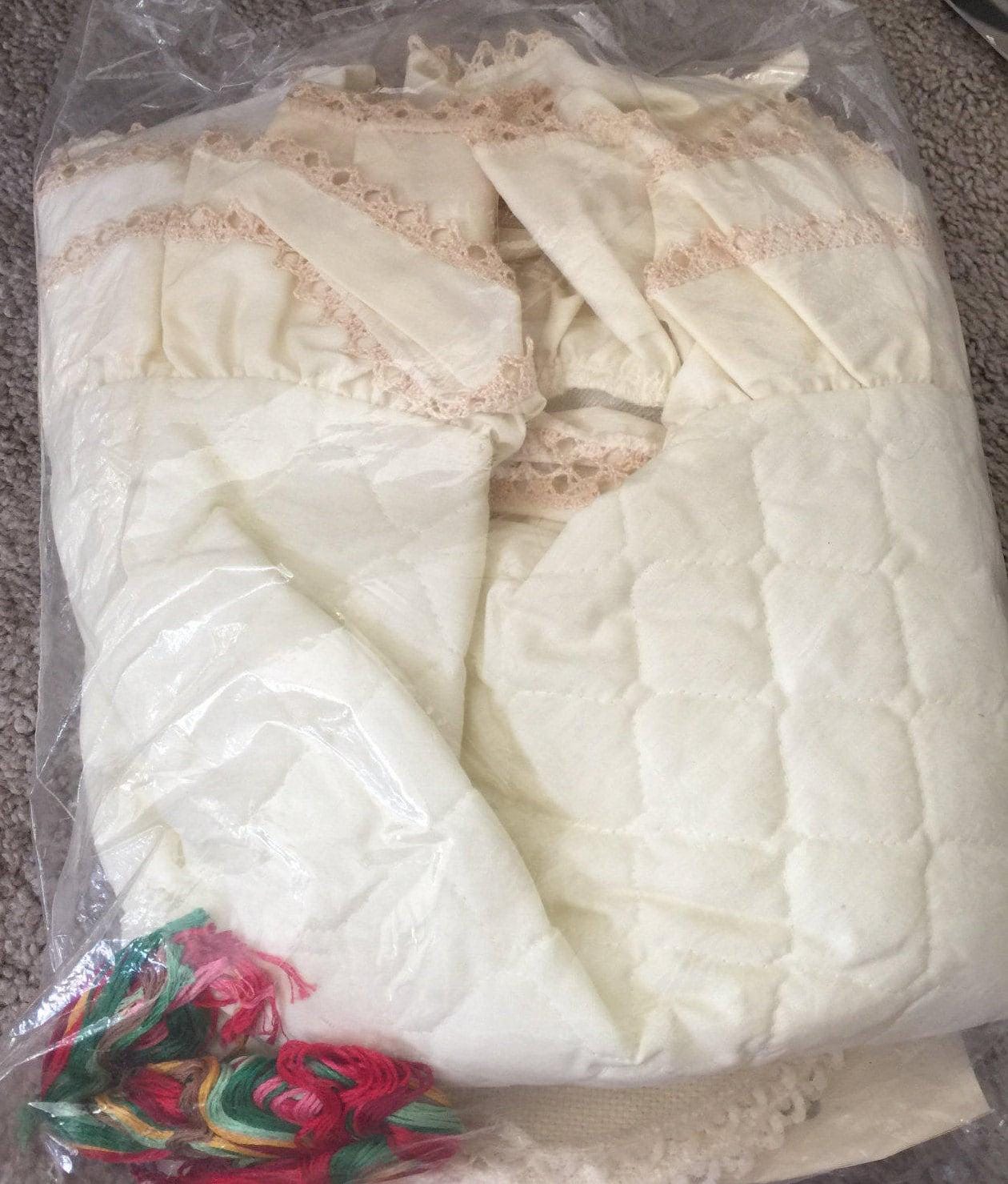 This is the Poinsettia Christmas tree skirt counted cross stitch kit . It is from Mary Maxim and features on off white lace and quilted tree skirt complete with floss to finish this design. The package was opened , but has never been used and is in new condition.