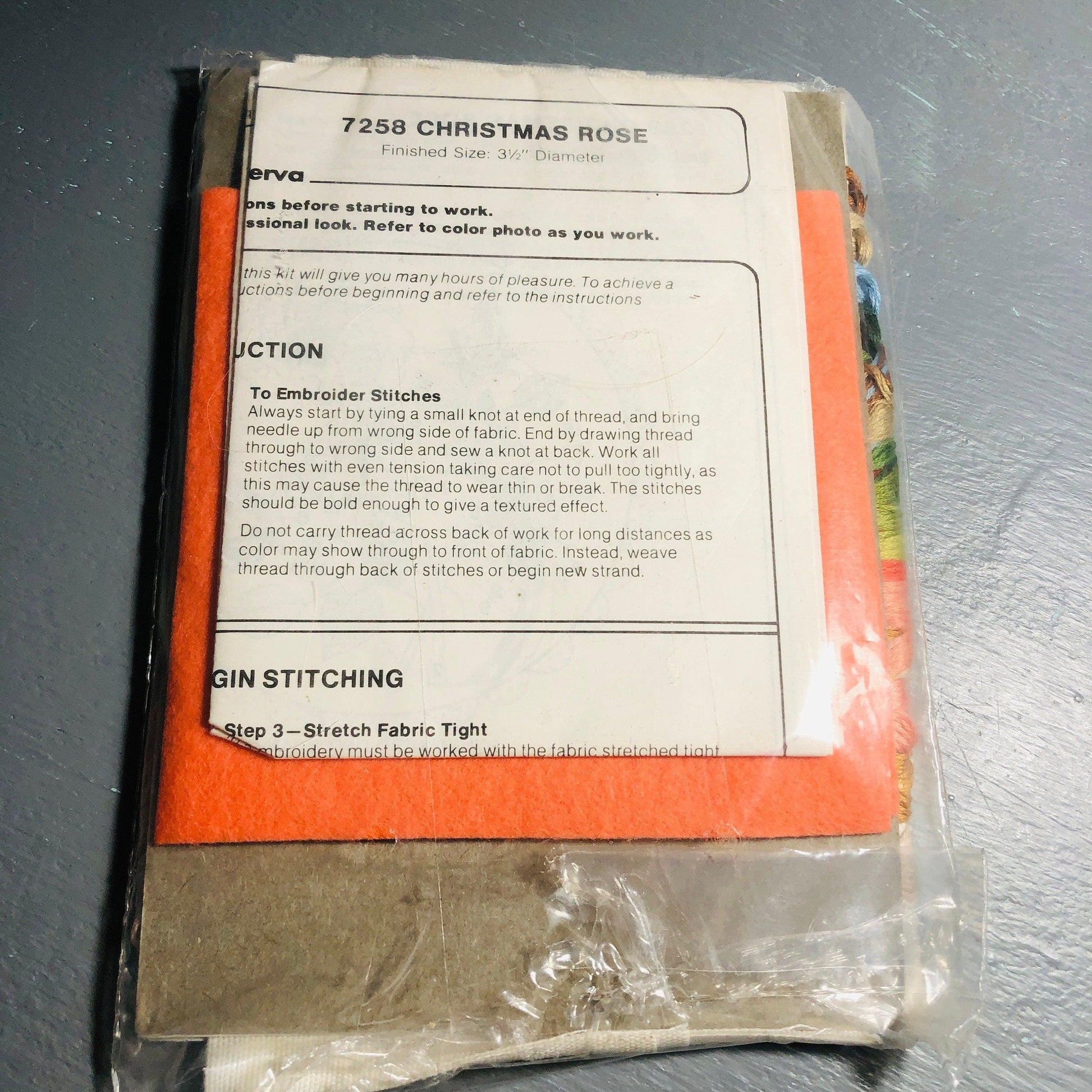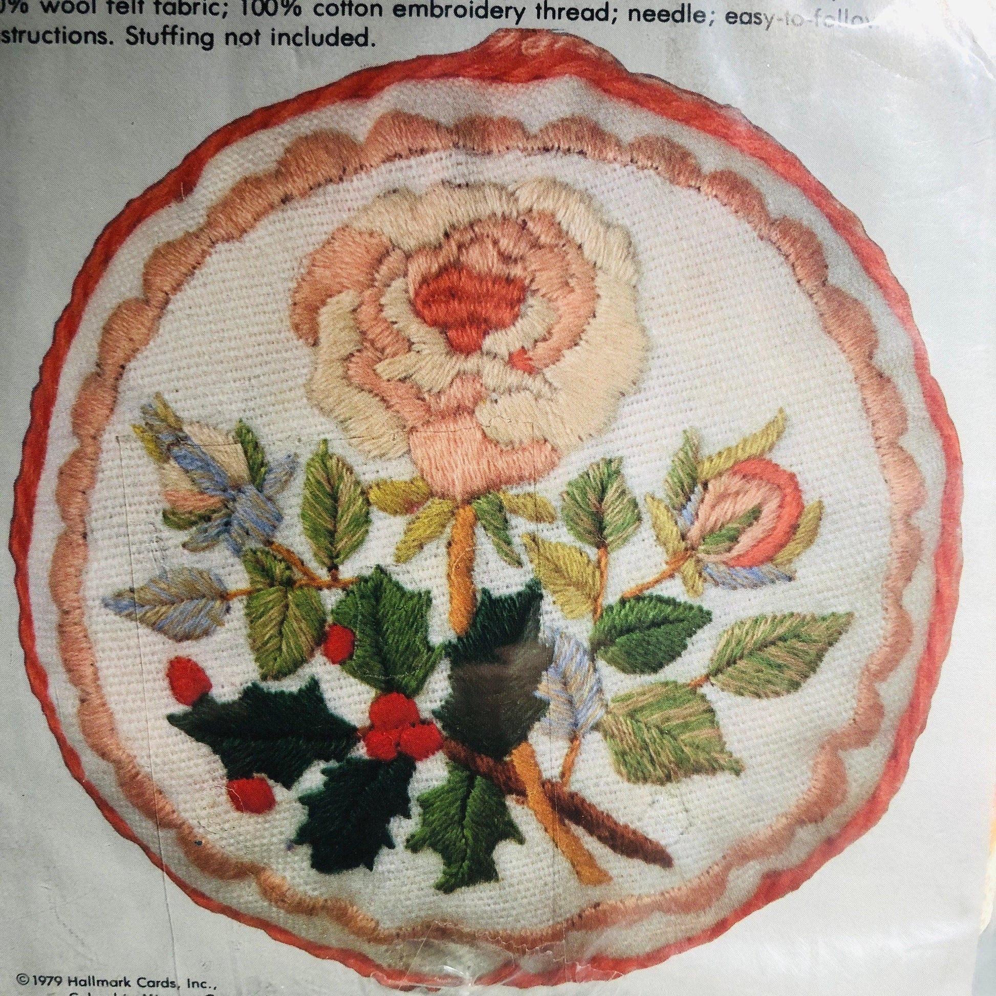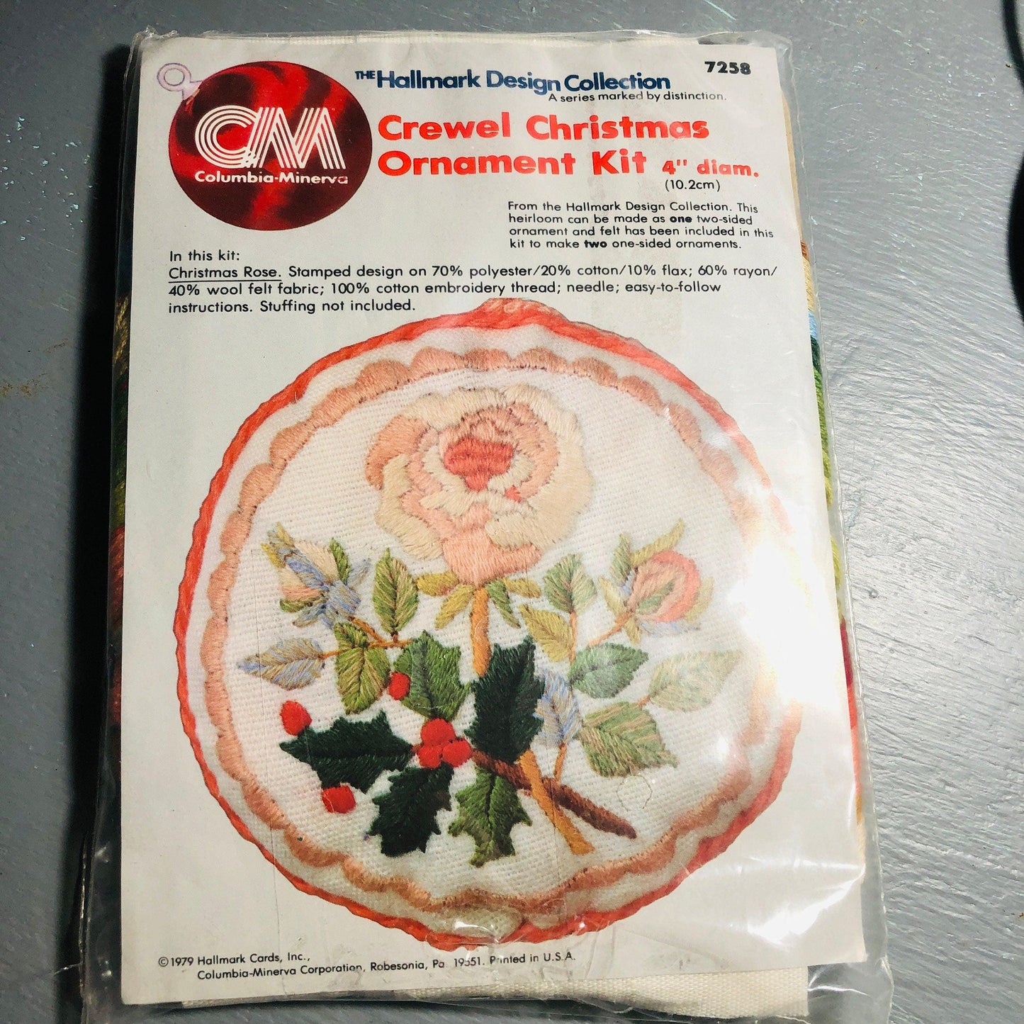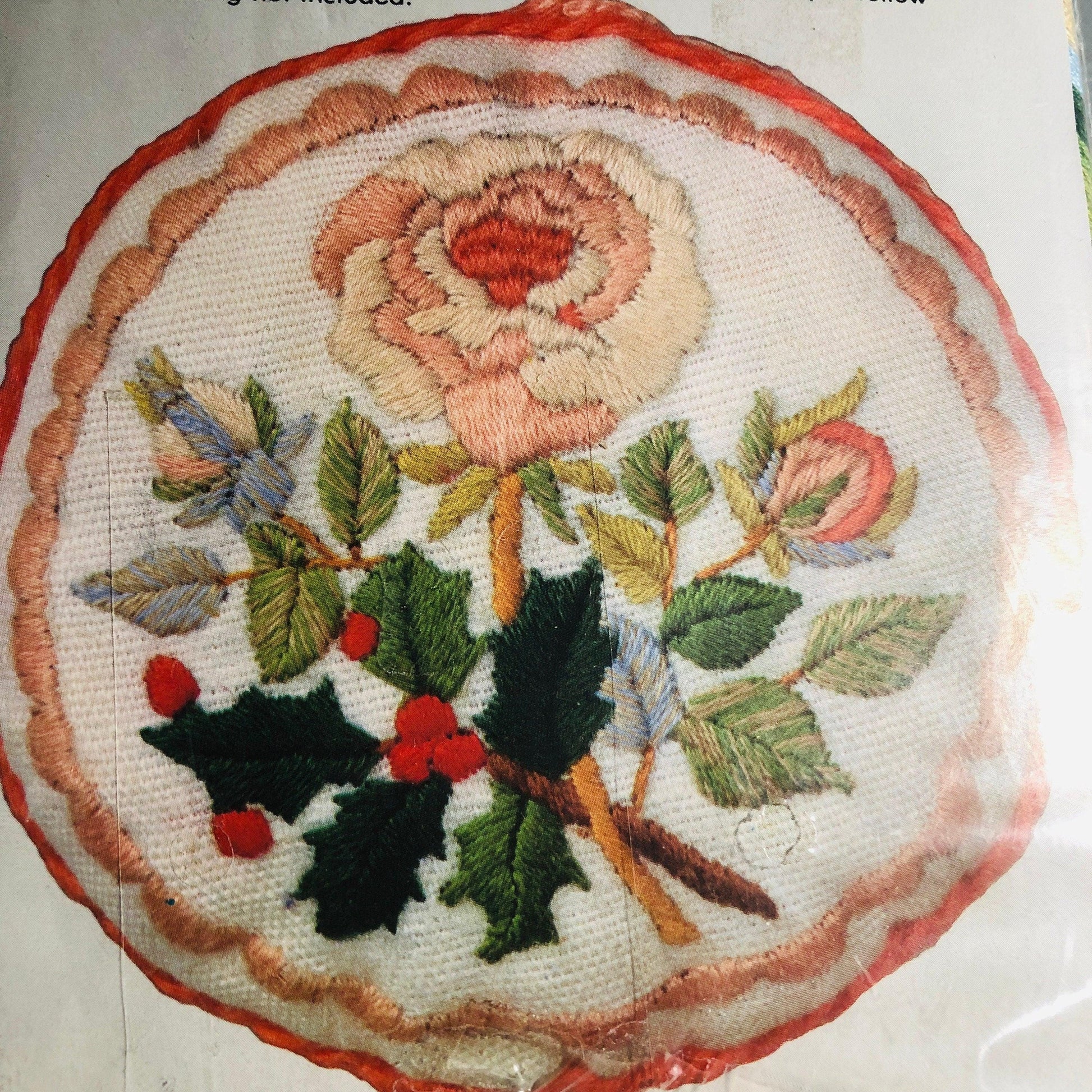 Columbia-Minerva, Christmas Rose,Vintage 1979, Crewel Christmas Ornament Kit, 4 Inch Diameter