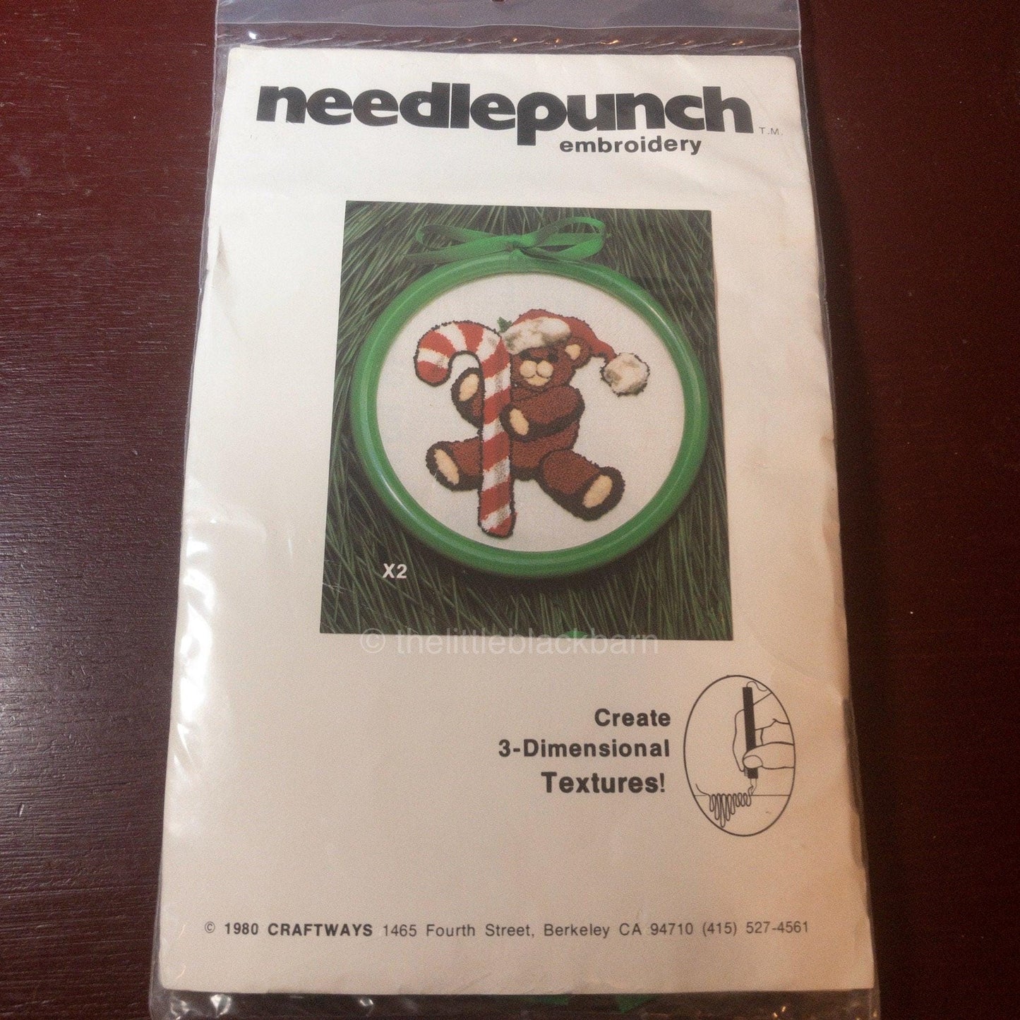 Craftways, Needlepunch, Vintage 1990, Embroidery Kit, Santa Teddy Bear Holding a Candy Cane