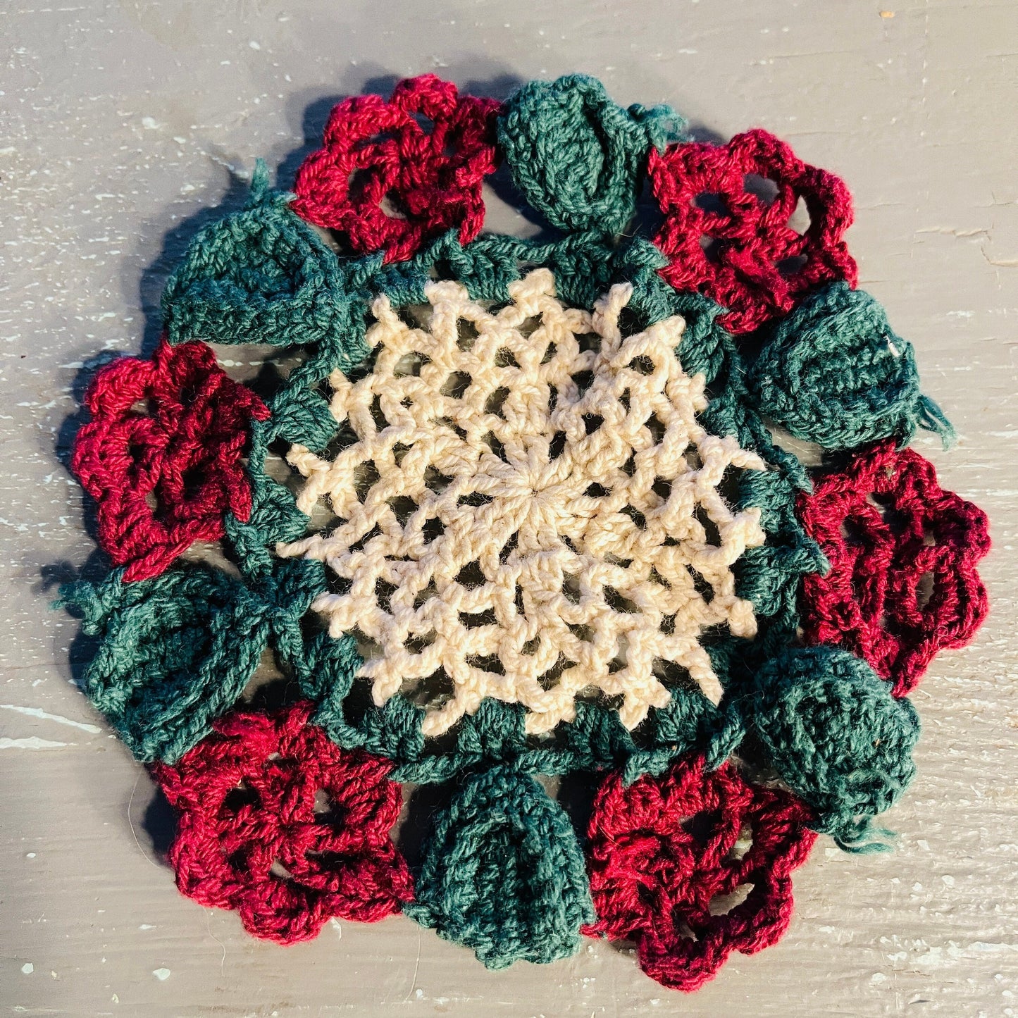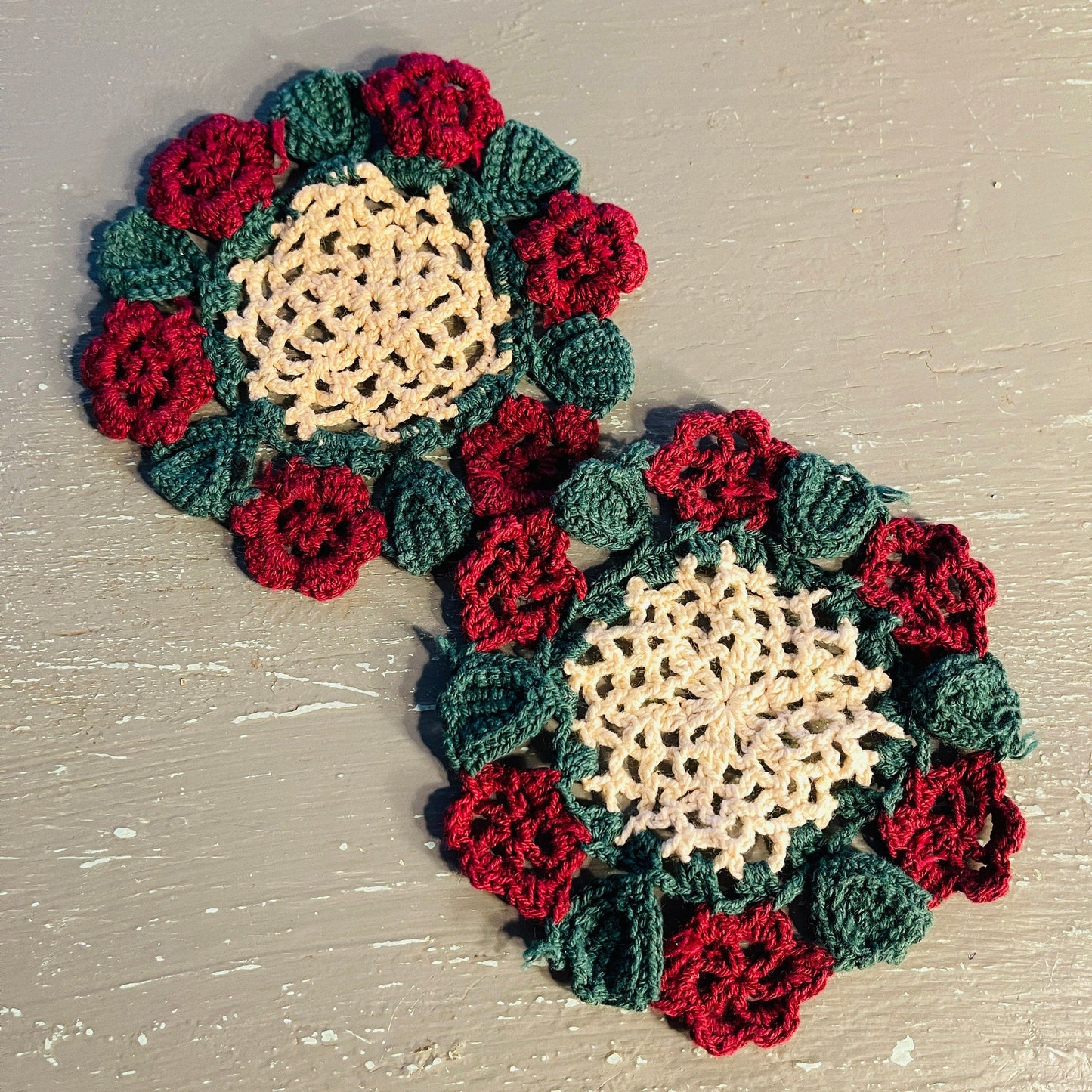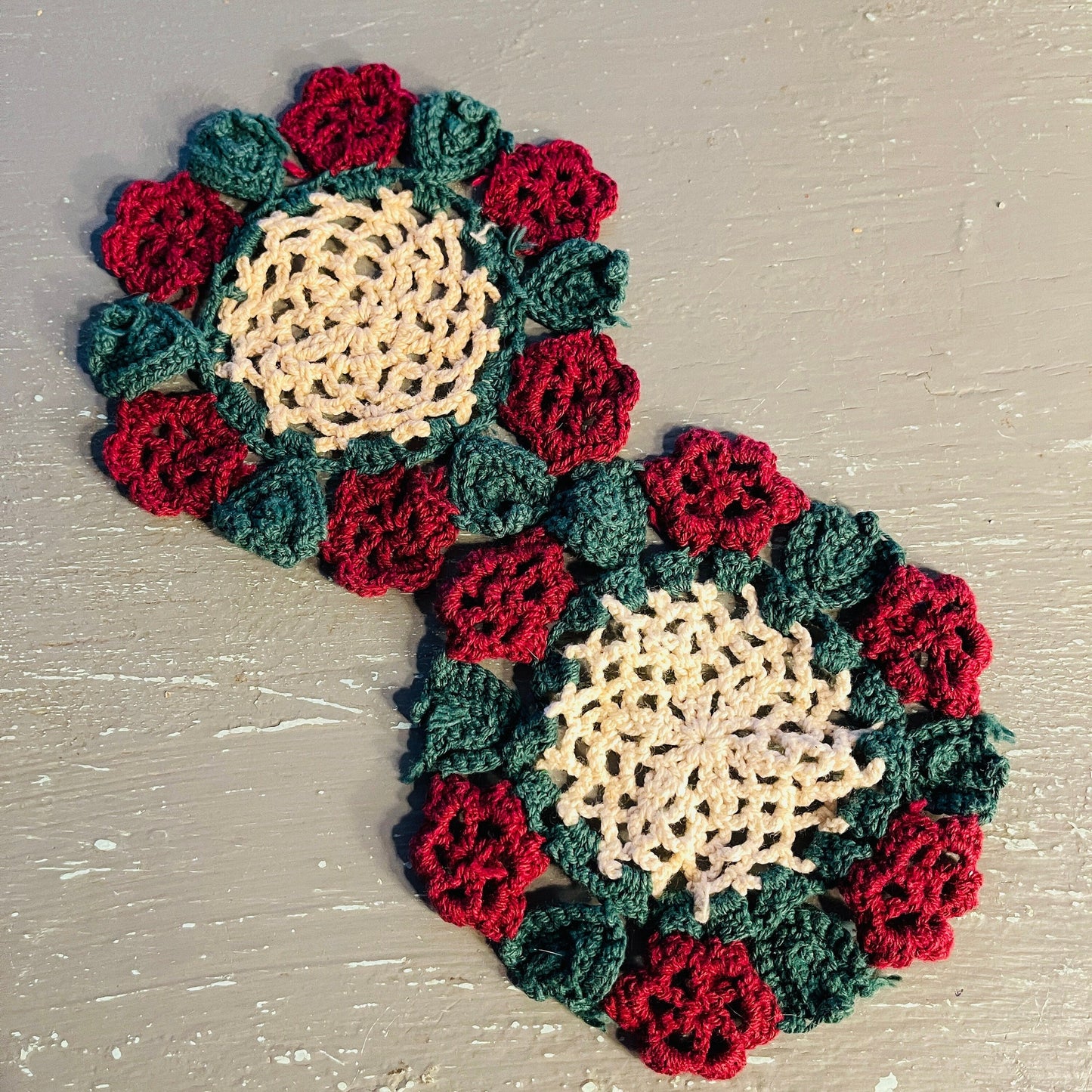 Dollies, Pair of Hand Crocheted, Vintage 4 Inch Round Burgundy, Green and White Collectible, Finished Decorations
