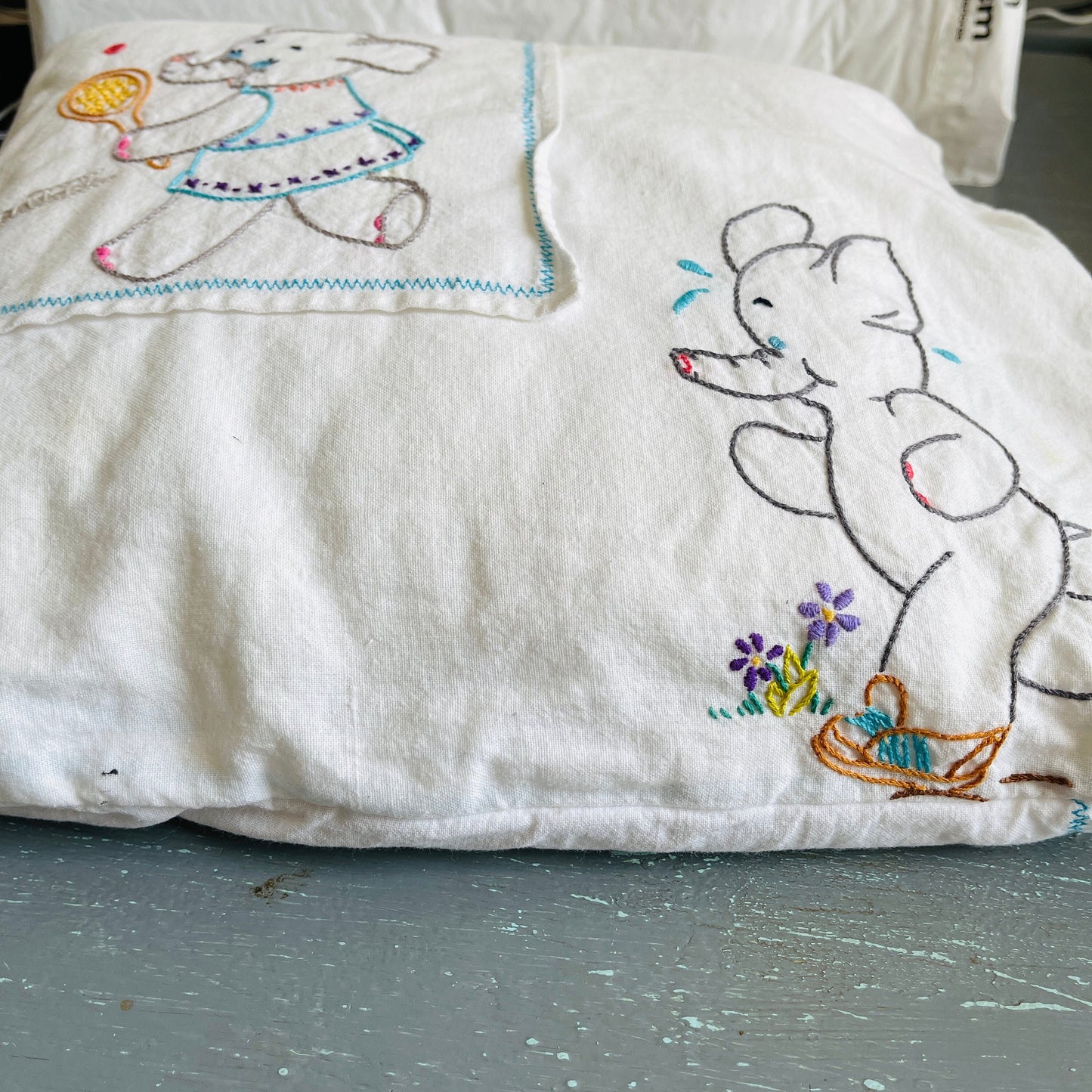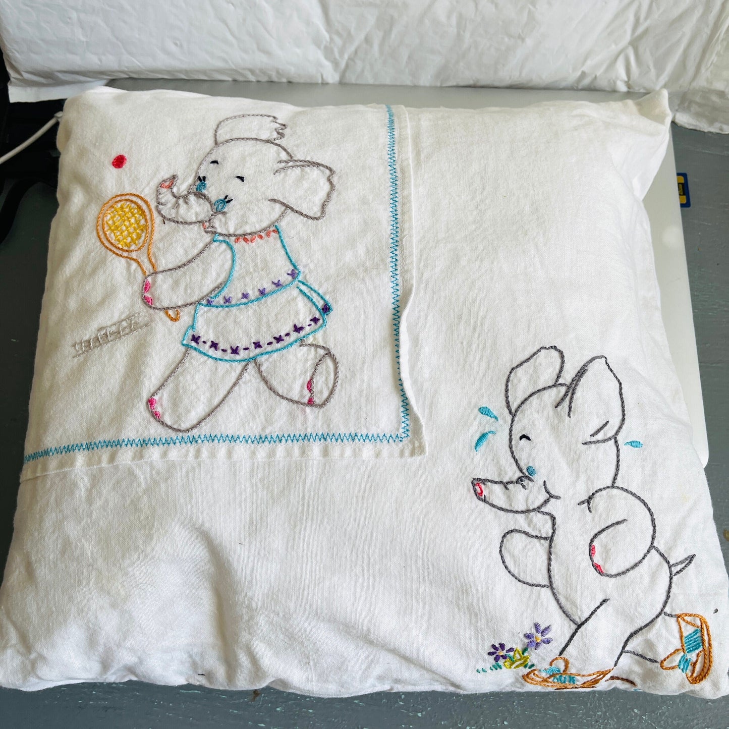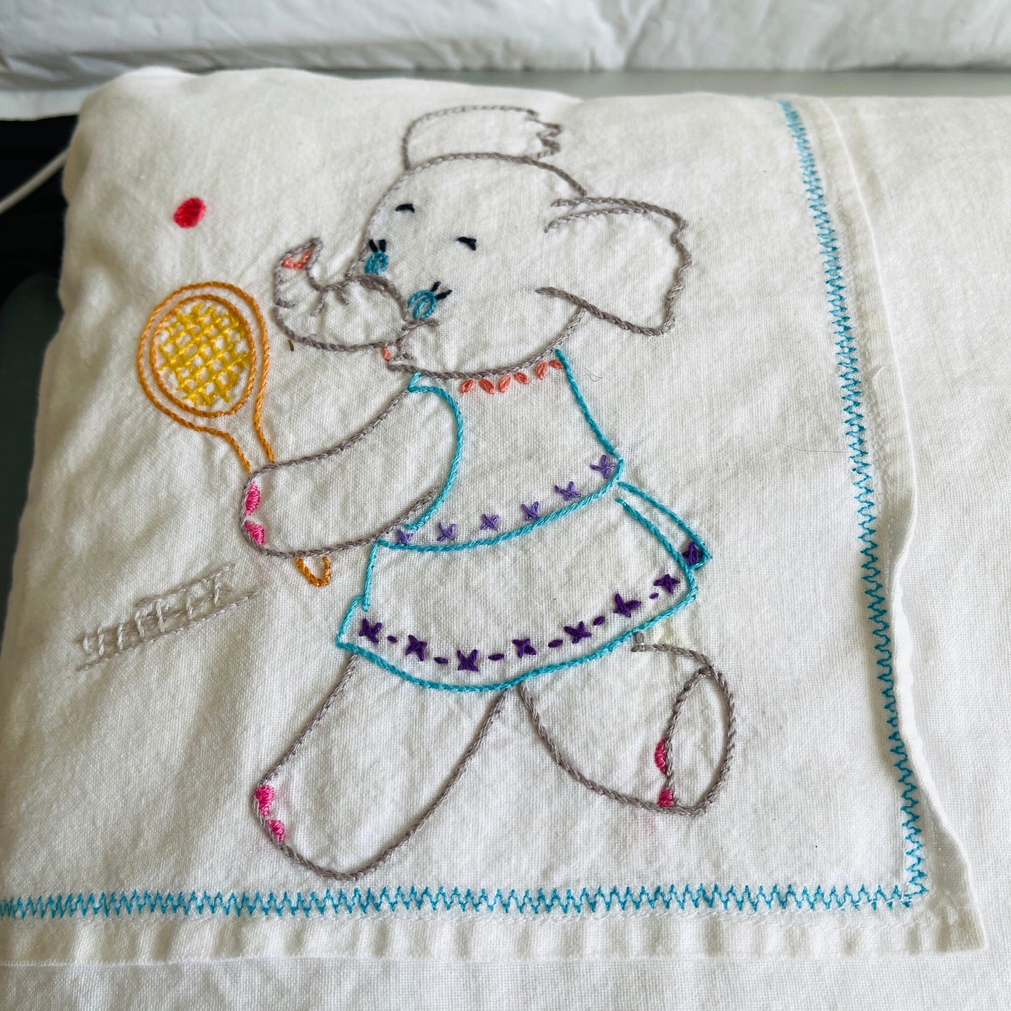 Elephants running and playing tennis, vintage hand embroidered pillowcase