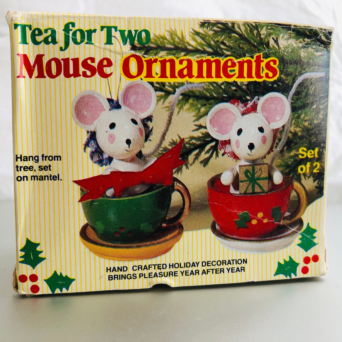 Giftco, Tea For Two, Mouse Ornaments, Vintage 1983, Set Of 2, Wooden Ornaments