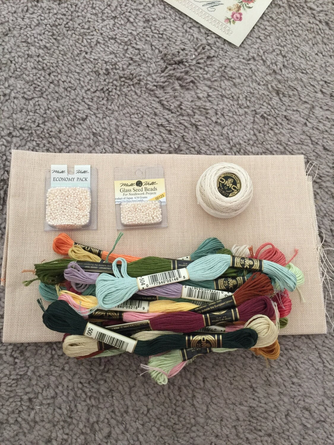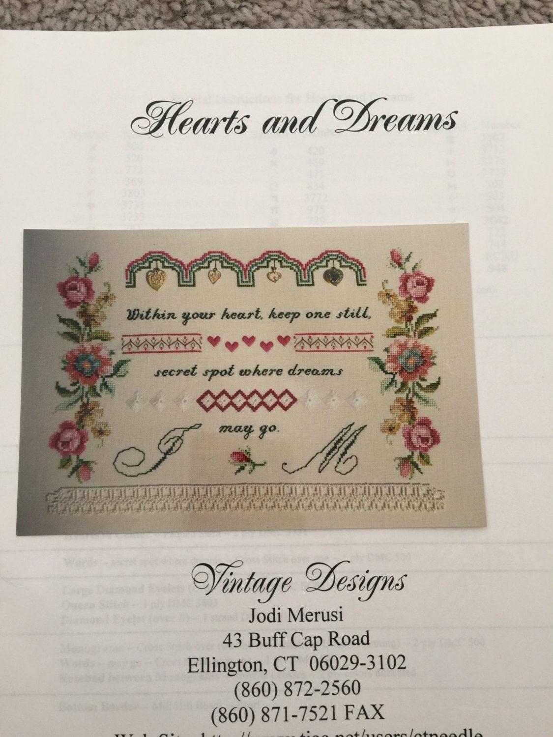 This is the Hearts and Dreams counted cross stitch kit by Vintage Designs. It says "Within your heart, keep one still,secret spot where dreams may go". It comes with the fabric, floss and mill hill beads to complete this project. The picture shows 4 small heart charms , but that is not part of this kit . You may add your own charms or complete project without adding them as they are not needed. This is perfect for any wedding, anniversary or just celebrating love !!