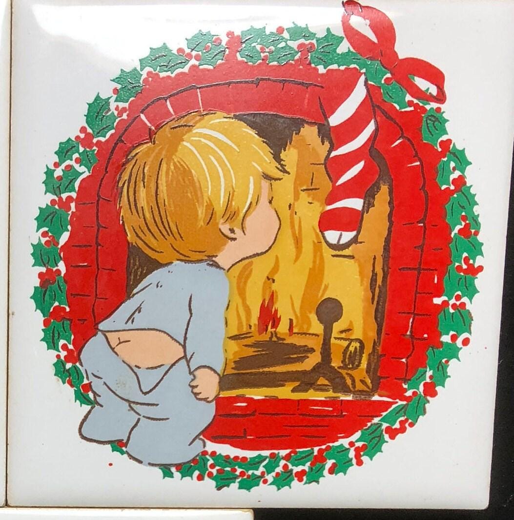 Jasco, Child with Teddy Bear, Christmas Tree, and (2) Two Boy by the Fire, Vintage, 1981, Set of Four (4) Tile Trivets