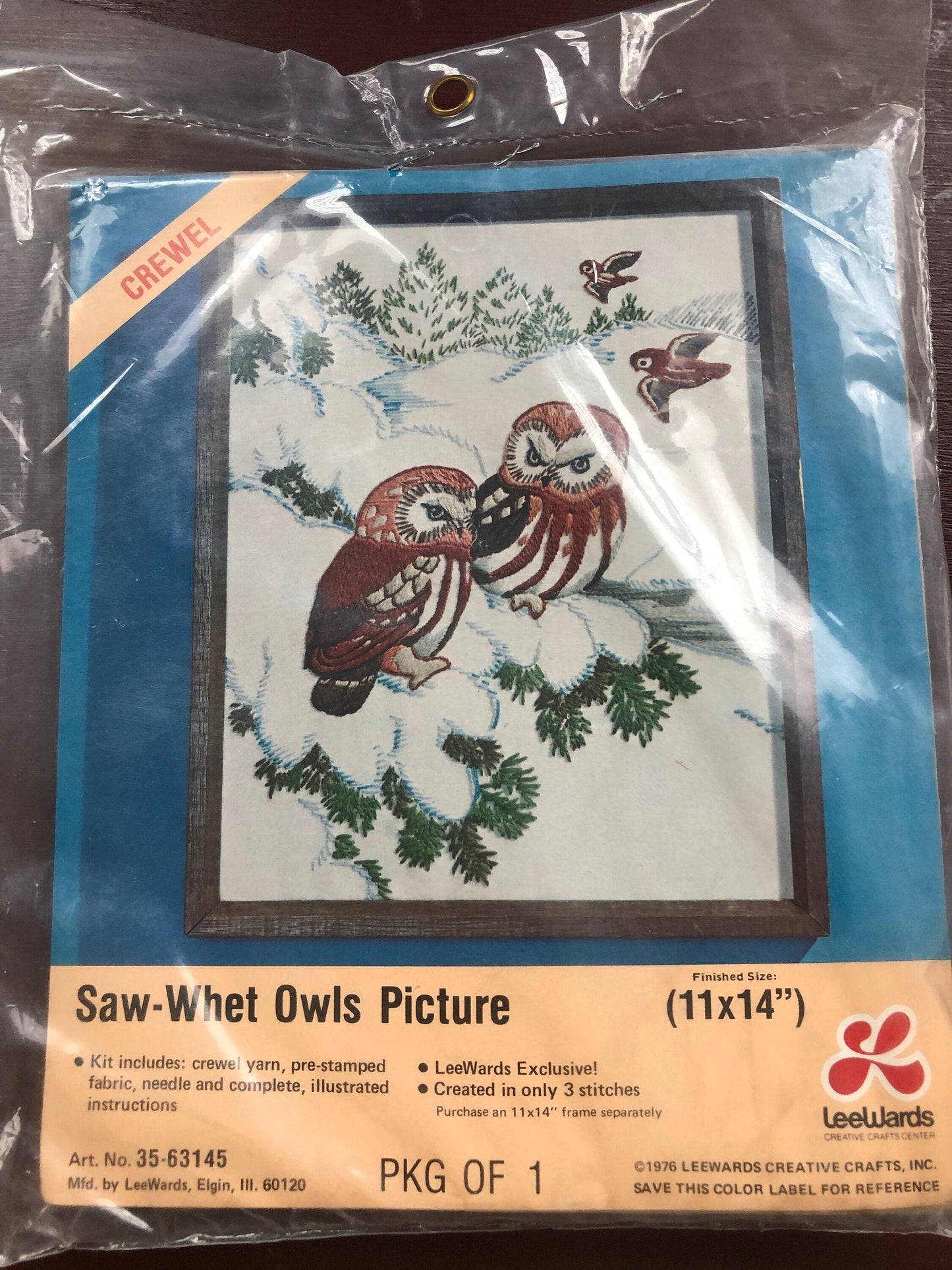 LeeWards Saw-Whet Owls Picture Vintage 1976 Crewel Kit 11 by 14 Inches Very Hard To Find