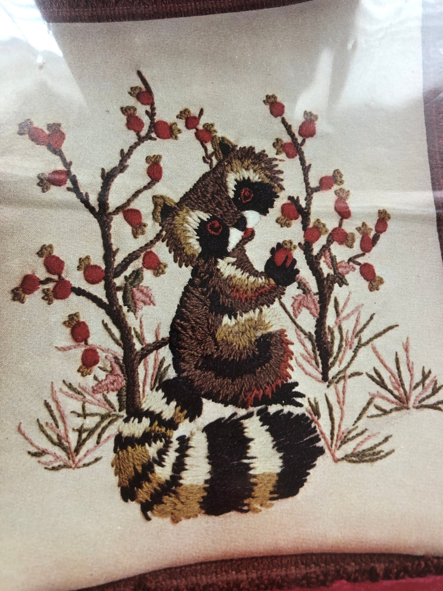 Winsome Raccoon Pillow, LeeWards, Vintage 1975, Crewel Kit, 14 by 14 Inch