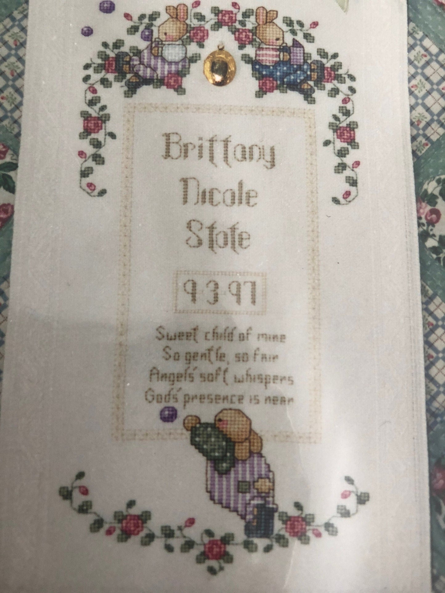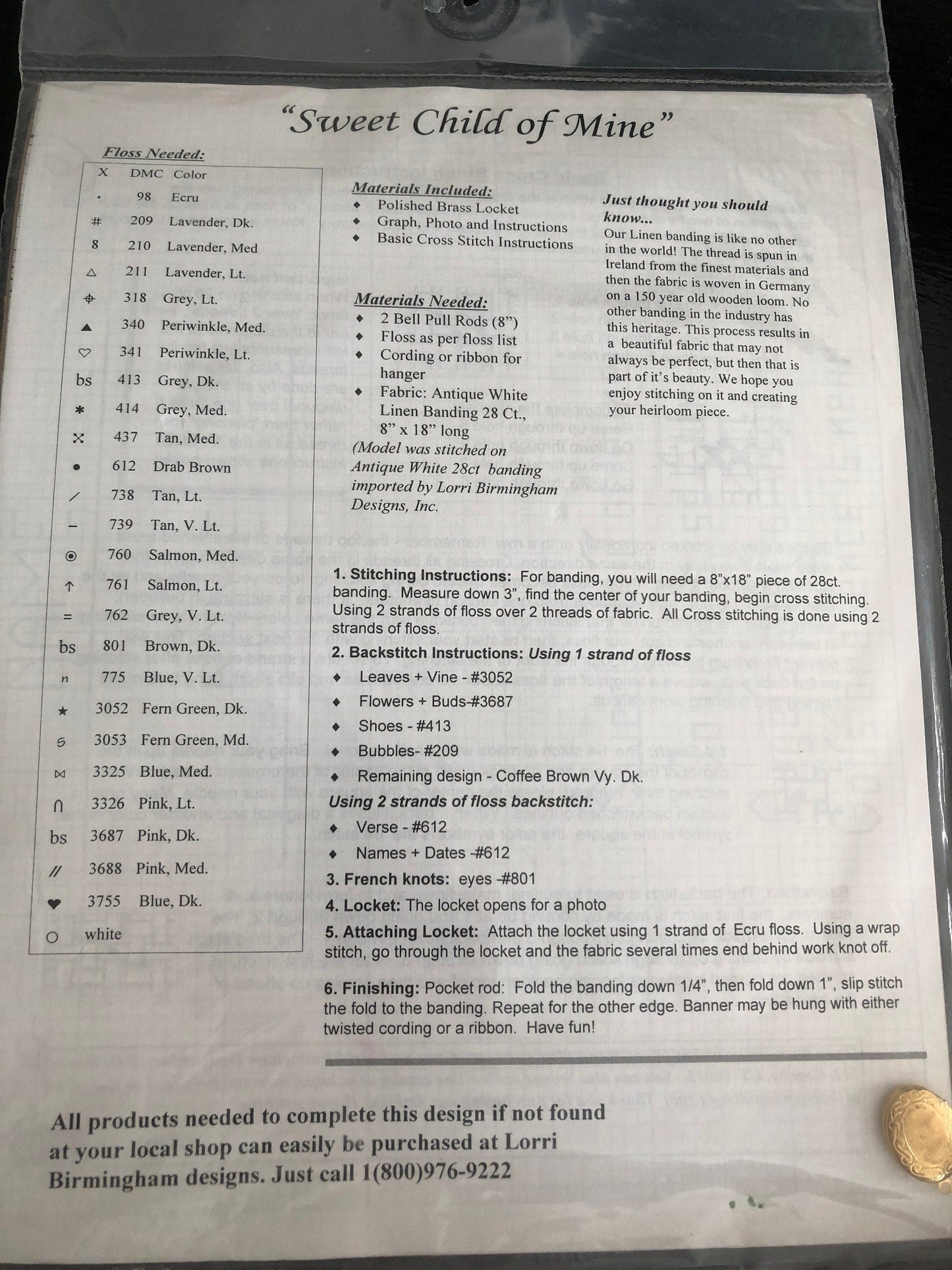 Lorri Birmingham, Sweet Child of Mine, Heirloom Birth Announcement, Counted Cross Stitch Pattern, Antique Gold Plated Locket Included 8x14" Approx. size