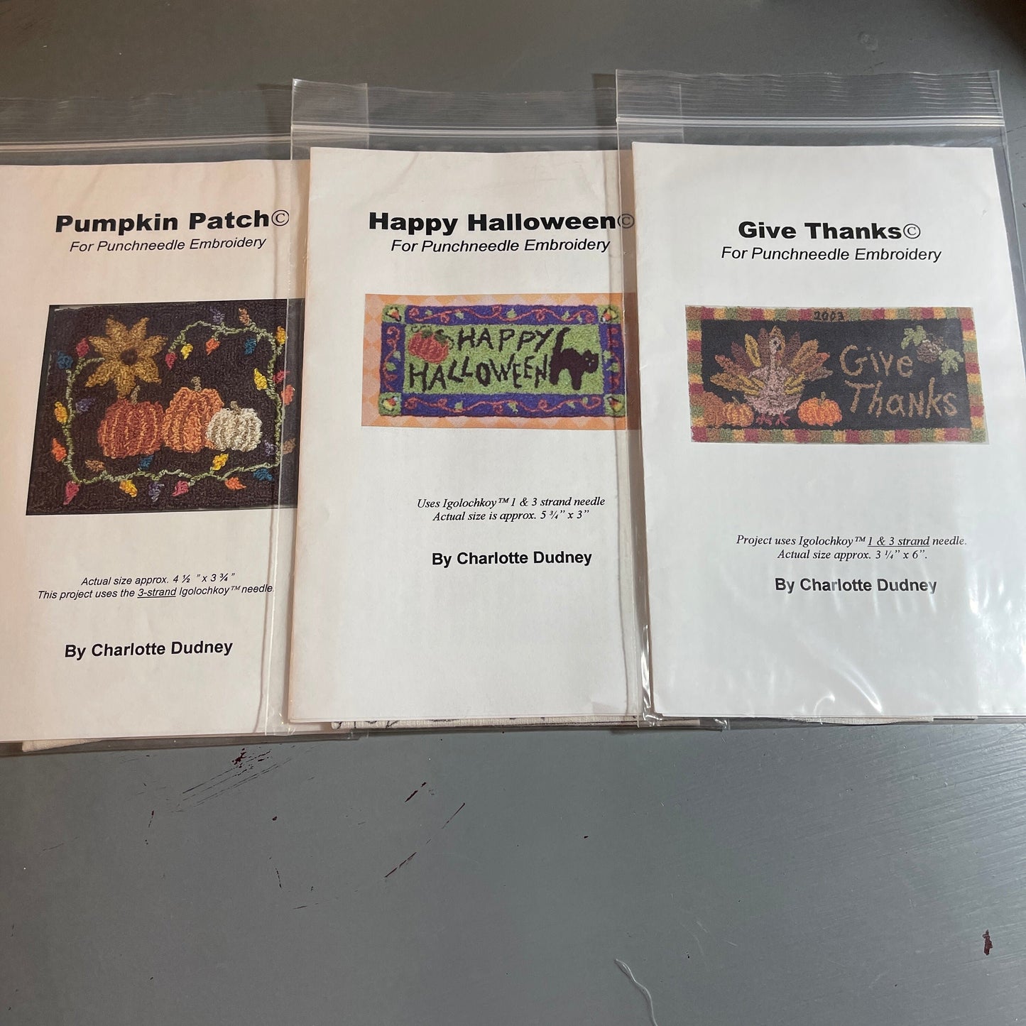 Pep'r Pot Choice of Punchneedle Embroidery Patterns By Charlotte Dudney Happy Halloween, Pumpkin Patch, or Give Thanks