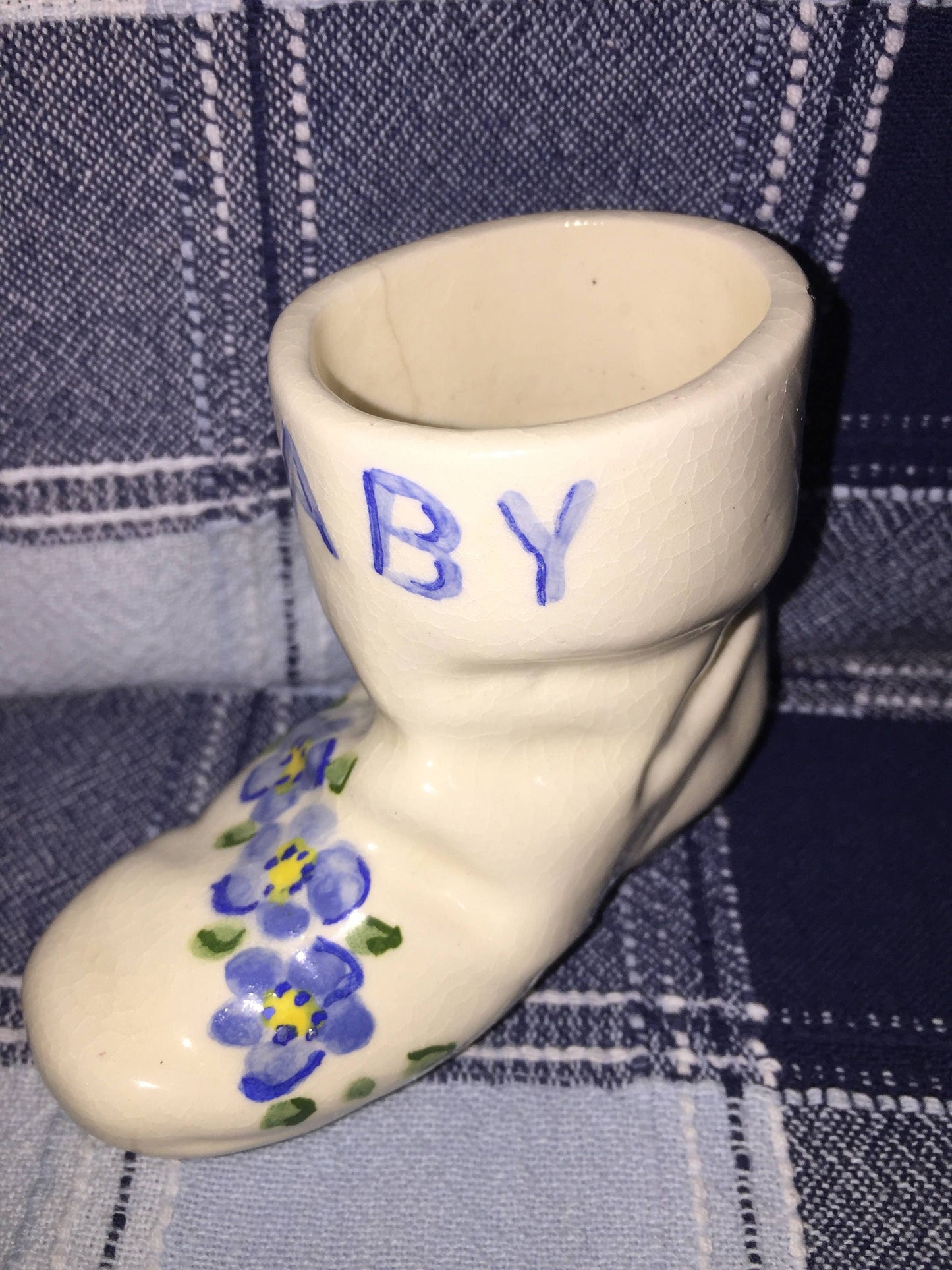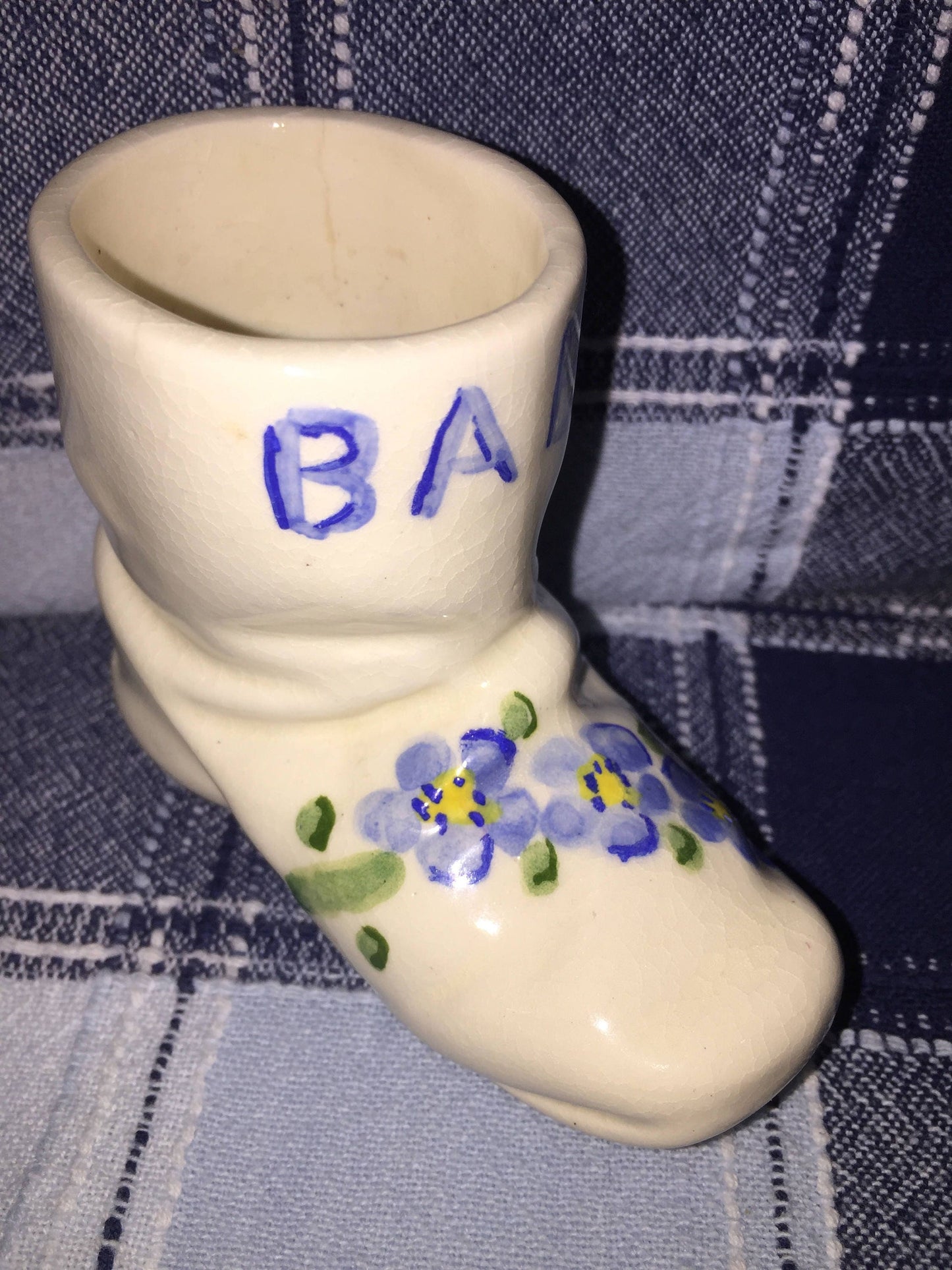 Vintage ceramic baby boot pretty blue flower motif w BABY written on it, normal wear due to age