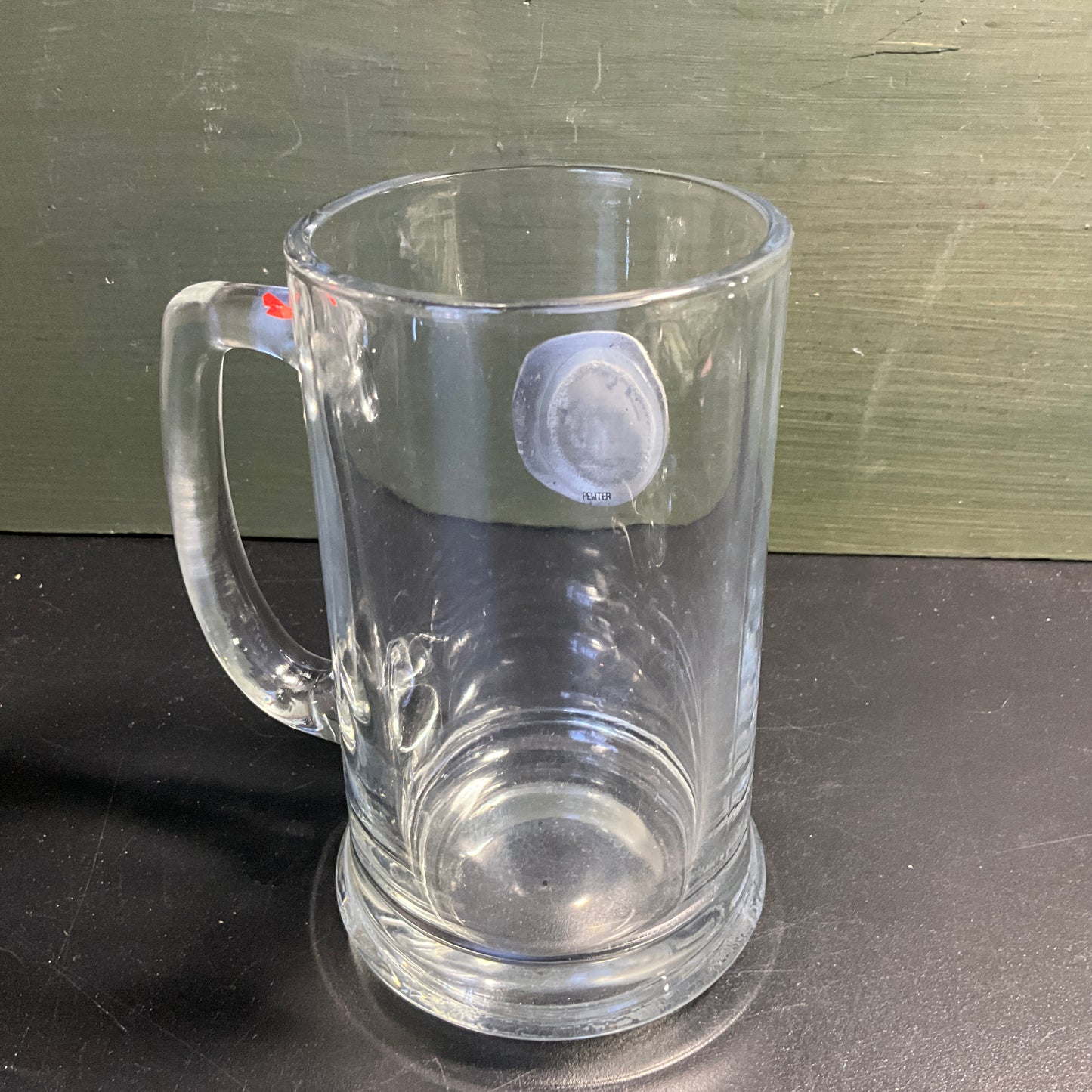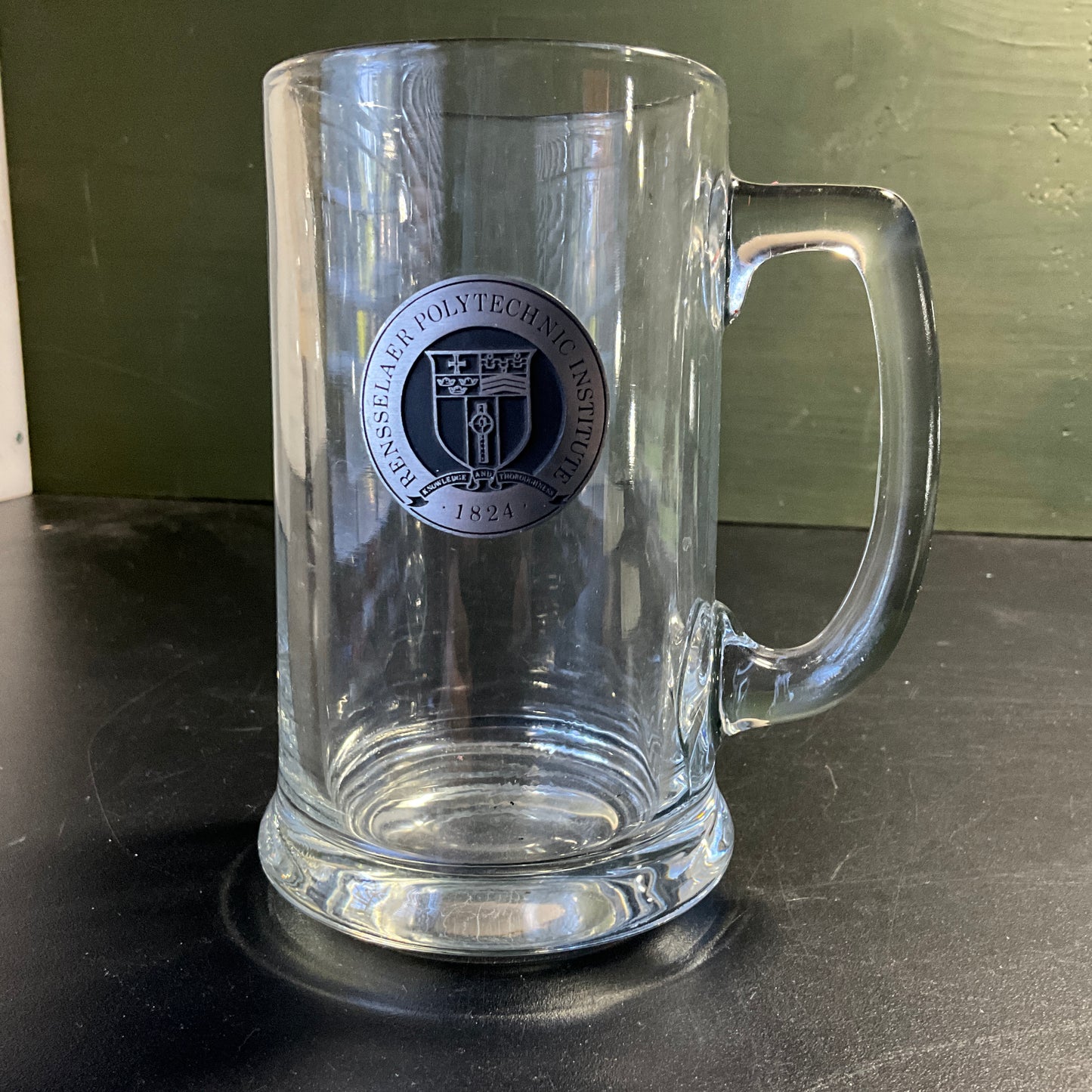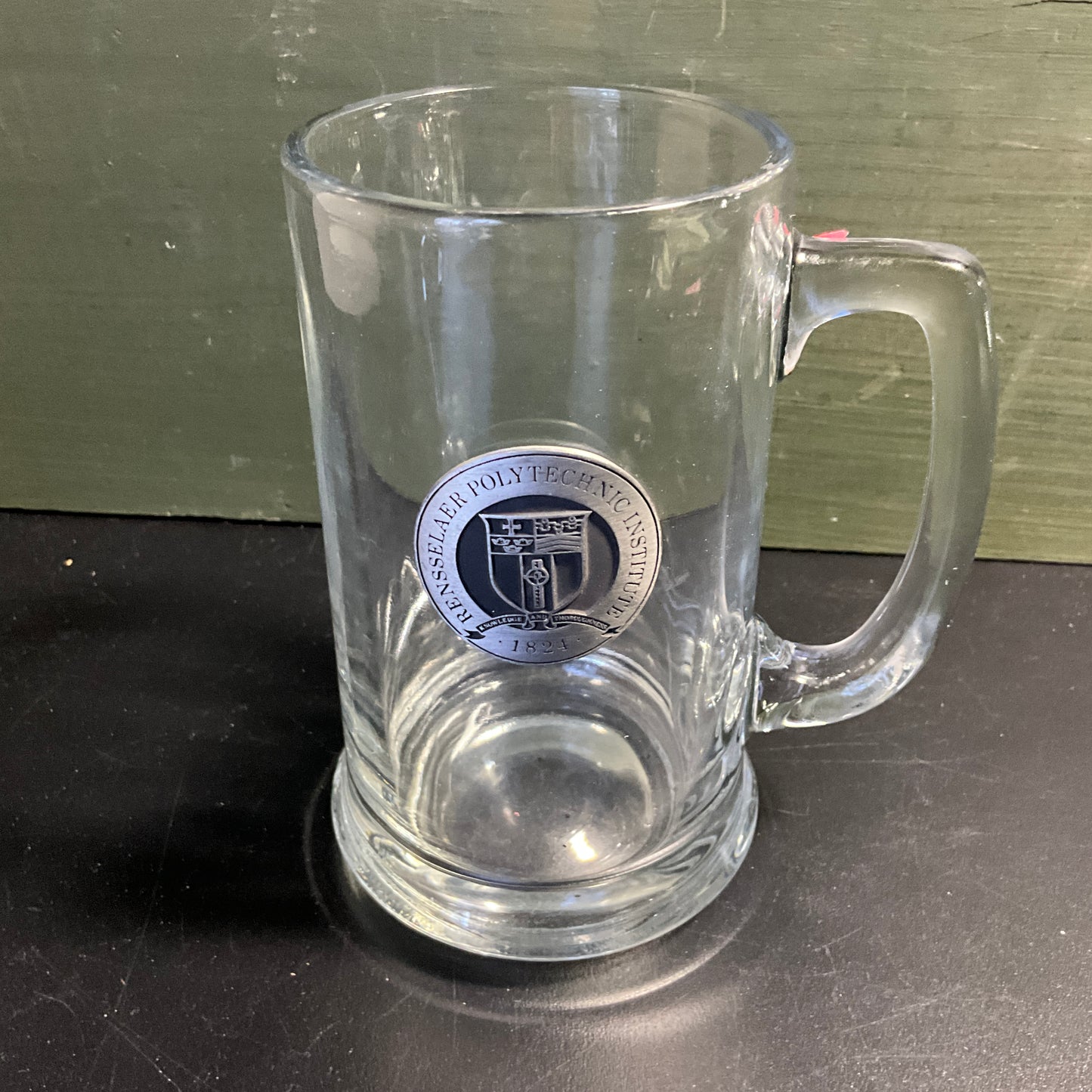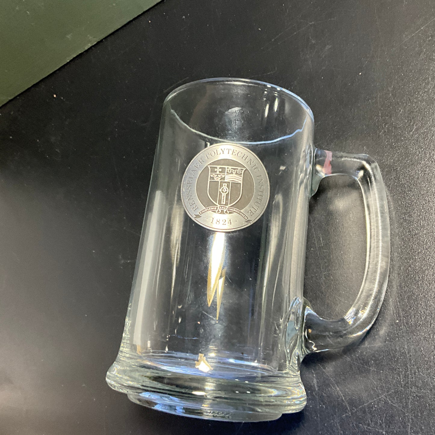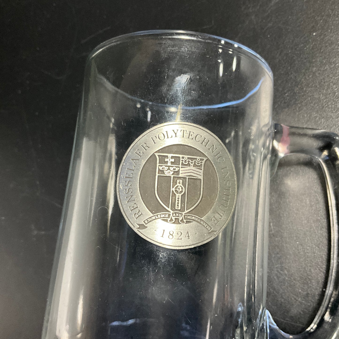 Rensselaer Polytechnic Institute pewter badge on clear glass mug vintage kitchen collectible
