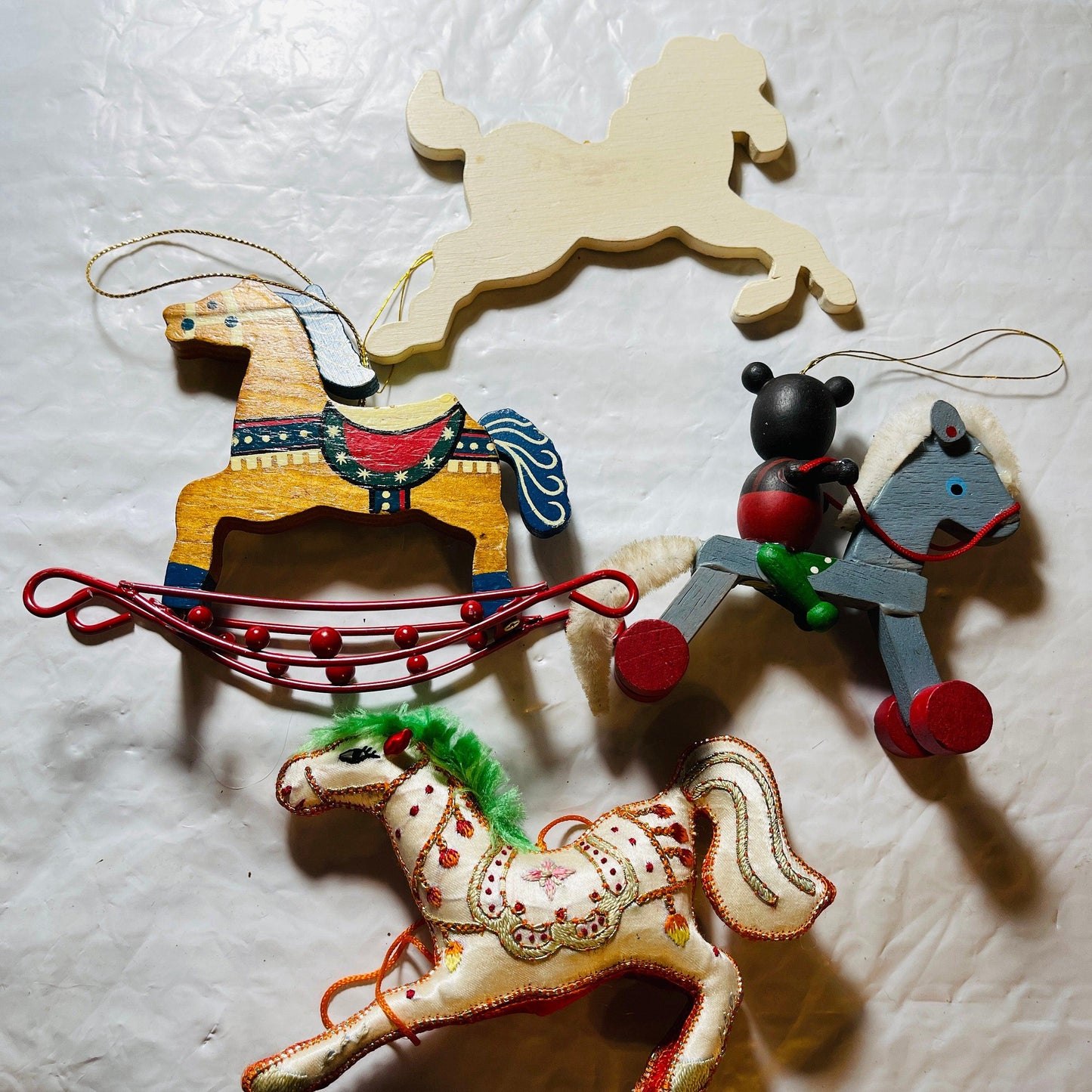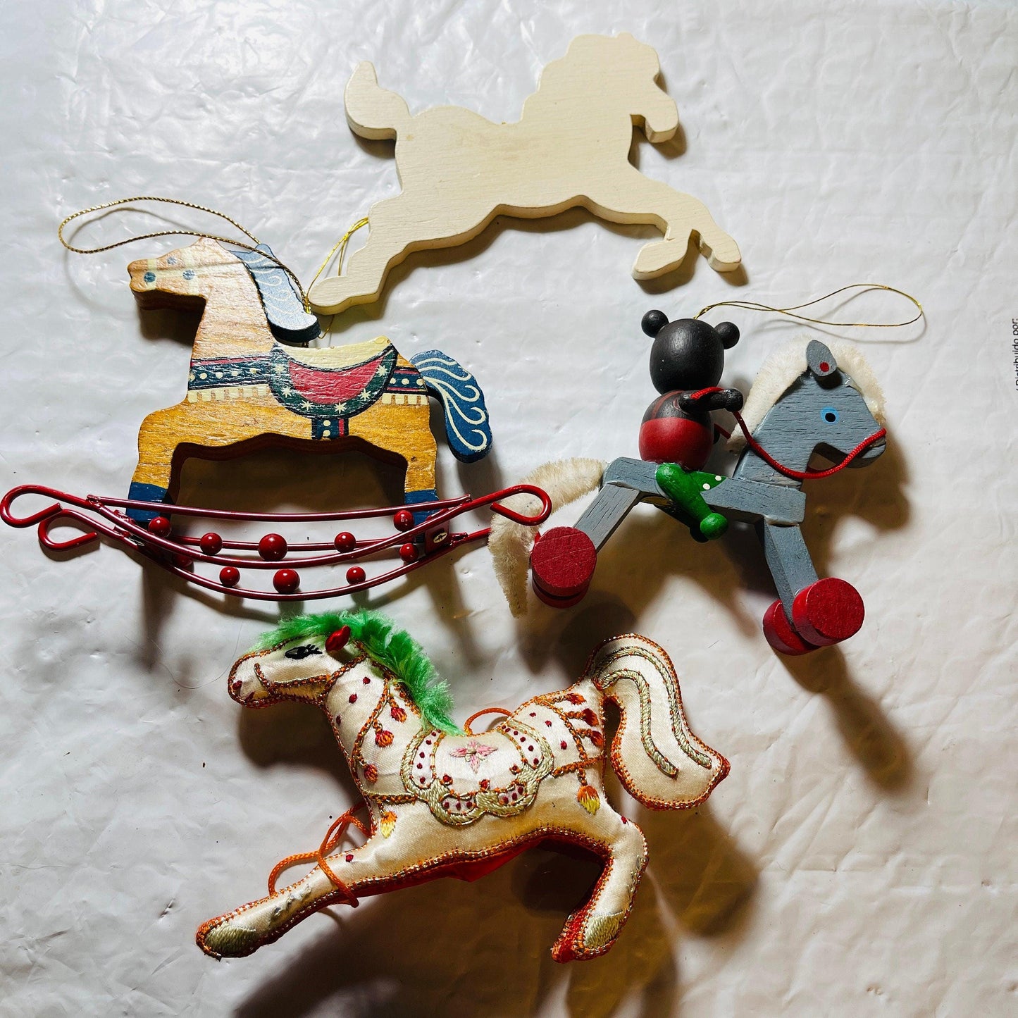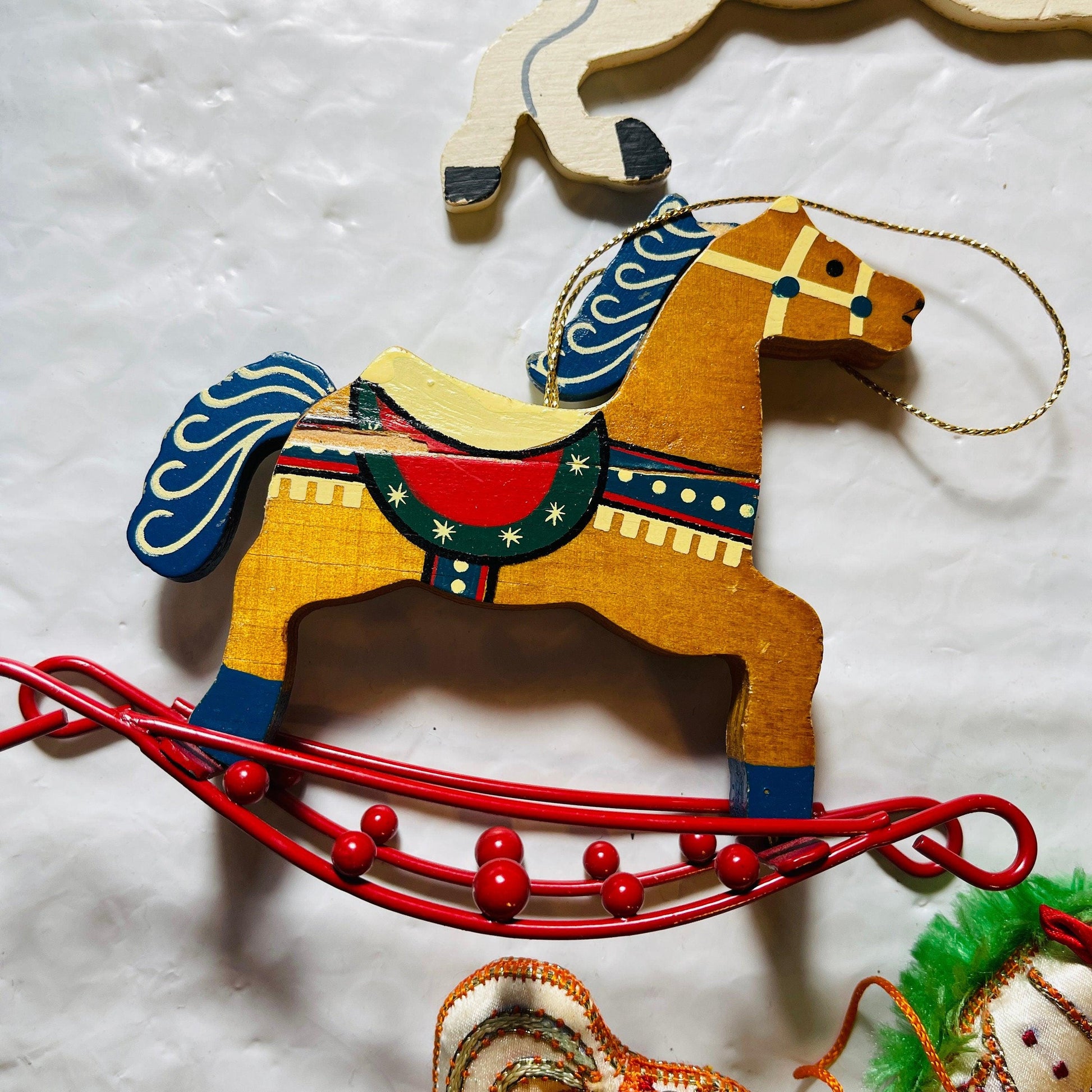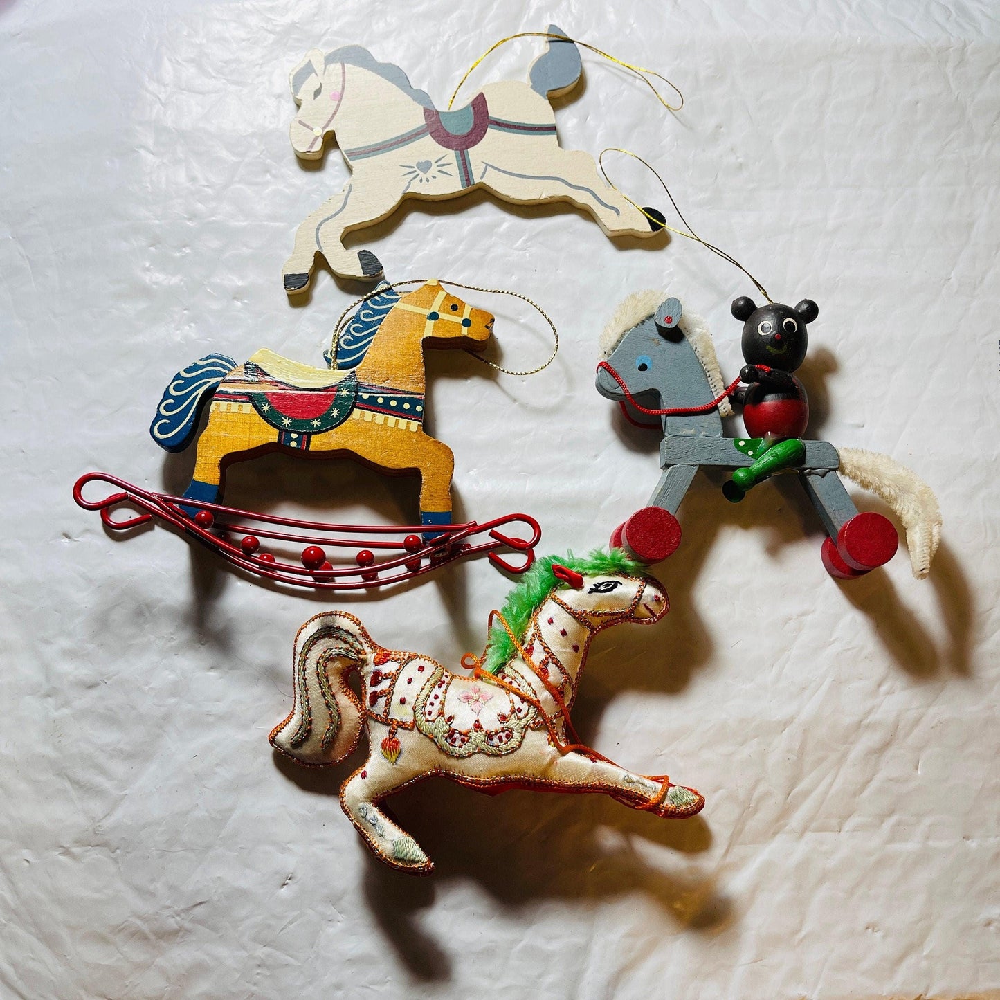 Rocking Horse, Set of 4, Wood, Metal and Fabric, Ornaments