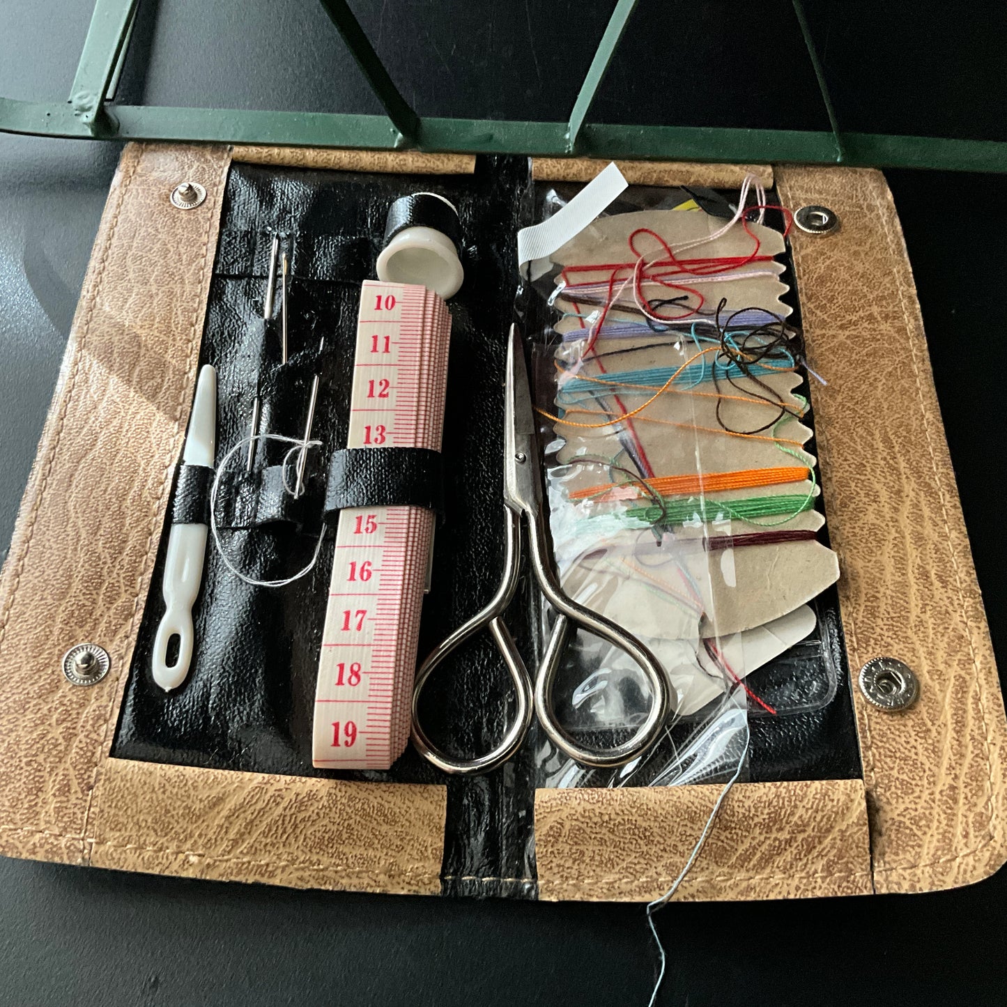 Sensational vintage sewing kit in stitched embossed with sewing notion graphic leather case