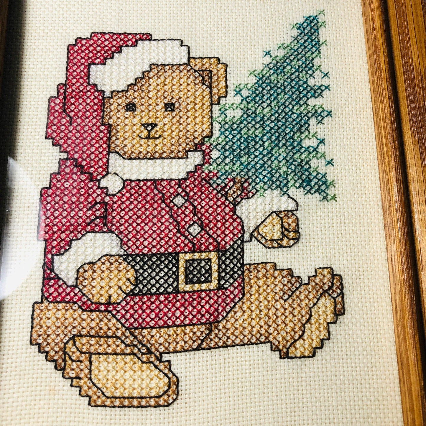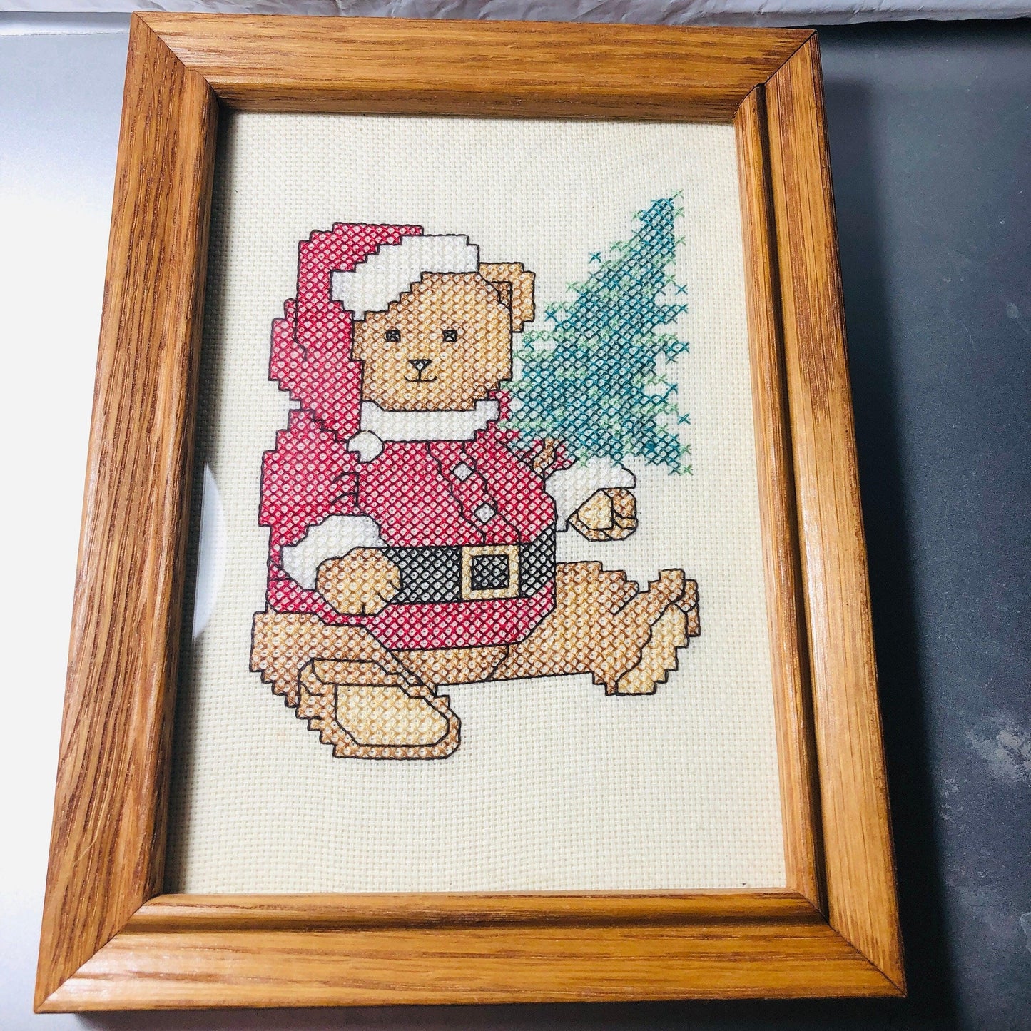 Teddy Bear in Santa Suit Holding Christmas Tree Vintage Finished and Framed Cross Stitch Picture