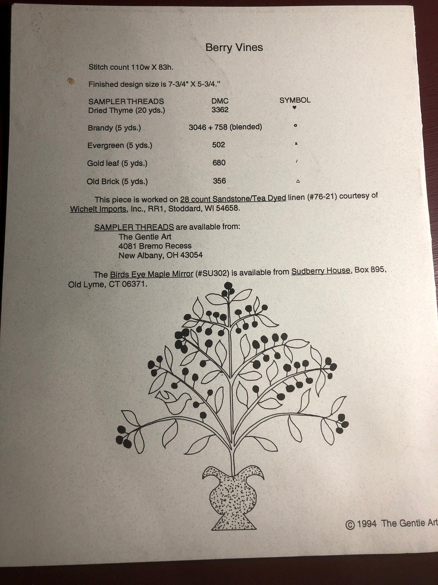 The Gentle Art, Berry Vines, Vintage 1994, Counted, Cross Stitch Pattern, Stitch Count 110 by 83