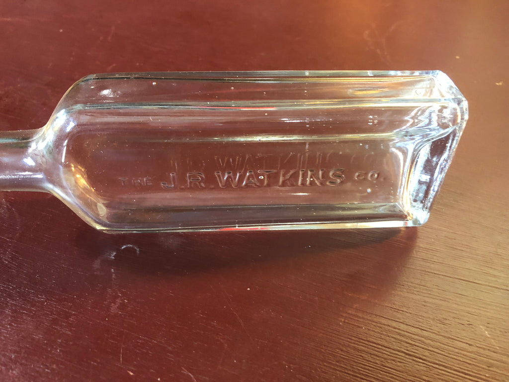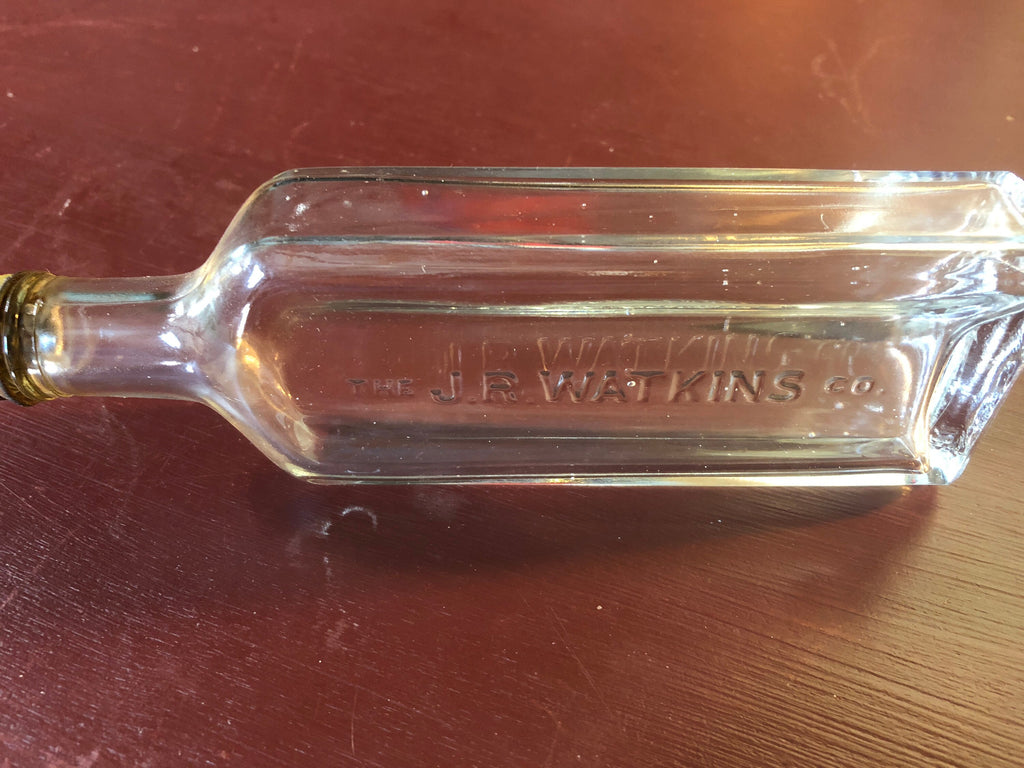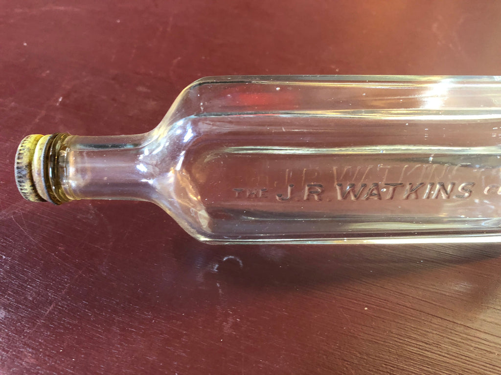The J.R. Watkins, Vintage Clear Rectangular, Liniment Bottle with matching metal screw cap imprinted with Watkins