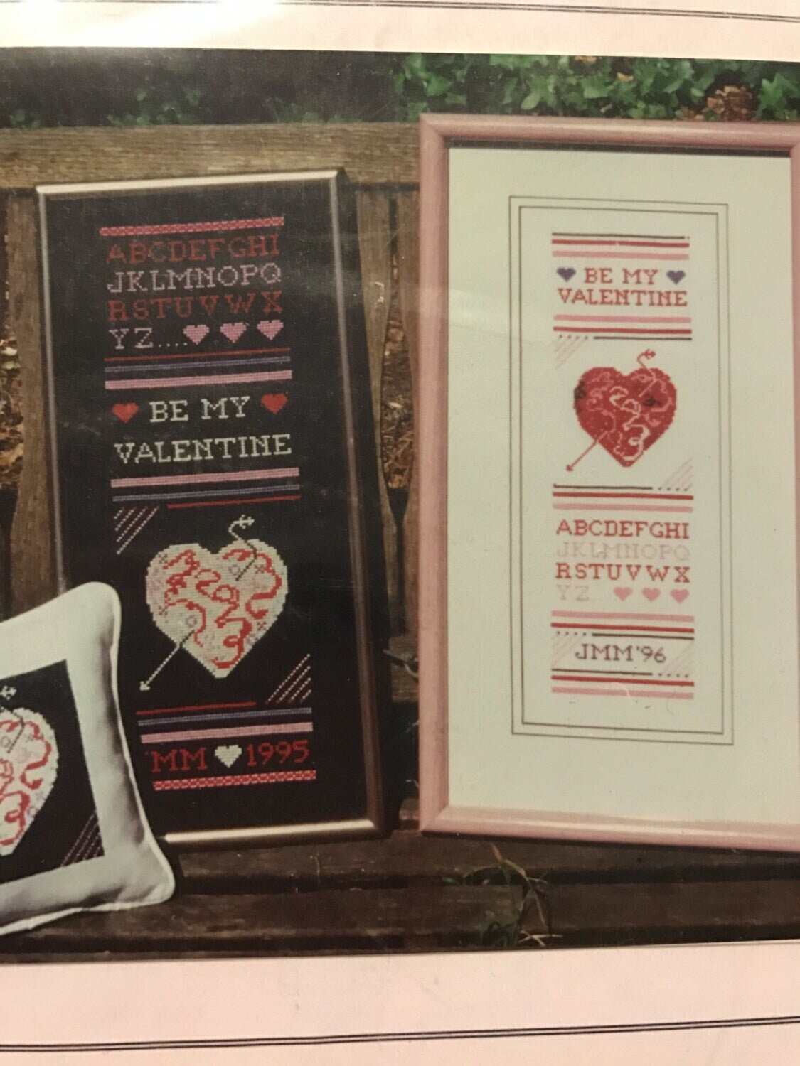 Vintage Valentines Day Marilynn and Jackie's Collectibles Funky Heart for black and white counted cross stitch kit . This very hard to find pattern is perfect for your Valentine's stitching. It comes with the pattern for 3 different pictures, but also included is the black cloth and 9 DMC colors to complete one of the designs.