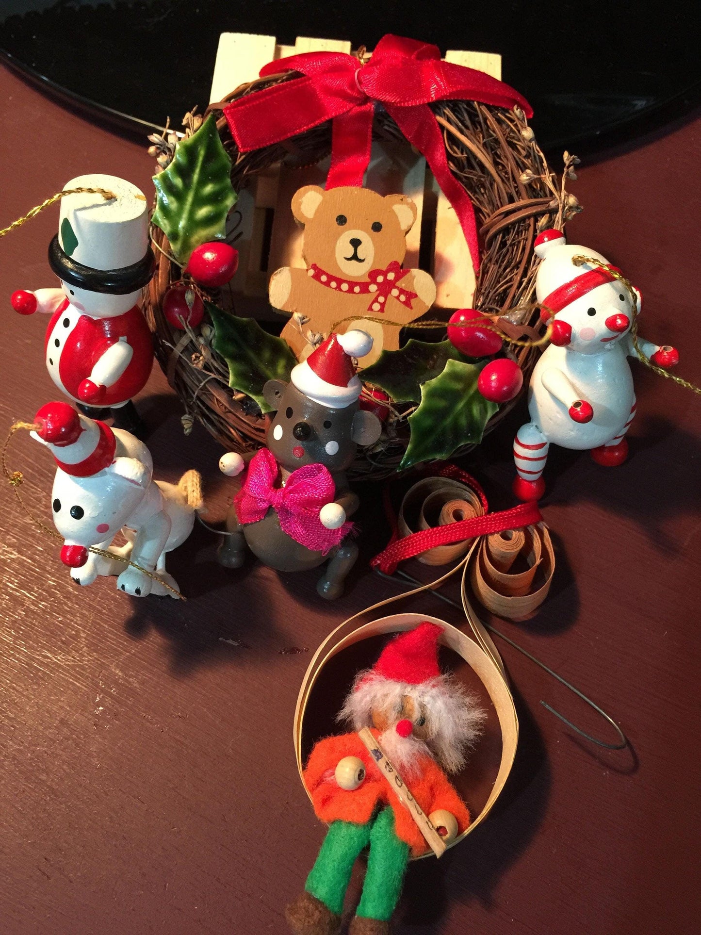 Wooden Christmas Ornaments Vintage set of 6 ornaments with Christmas wreath, mice soldier etc.